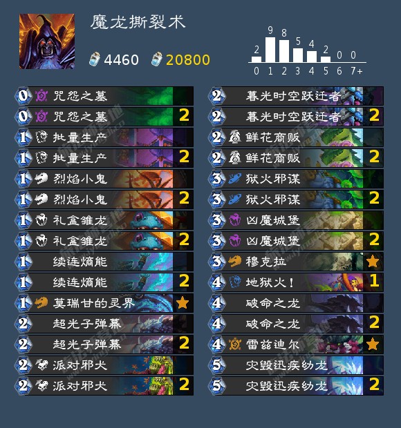 作为对上个版本雷兹迪尔处境的···“不幸言中”的补偿,我尽可能携带你了,就像我上个版本说的一样,带着你打快攻了。以时空撕裂体系为主轴的情况下, 剩下的卡片除了一些没有争议的优质卡,我还使用了少量的龙体系(礼盒雏龙+鲜花商贩)和恶魔体系(狱火邪魔在这个浓度下减费大概率可以触发,因此在自残没有什么明显收益的情况下替换掉了咒怨纪念品;而穆克拉和凶魔城堡同时在构筑内也使得雷兹迪尔相对可用)代价就是卡位不足以携带游客召唤师达克玛洛了,同样是优质卡片的恐惧猎犬训练师,甜筒殡淇淋和大地之末号也无法携带。具体而言也许需要踢掉一个体系来携带他,我个人倾向可能是从恶魔体系这边找,毕竟恶魔体系携带的原因是一些在快攻术士里的优质卡,如烈焰小鬼,派对邪犬,凶魔城堡都是恶魔,配合起来很简单。但反过来说也没有一定要配合他们的理由,如果表现不佳那么直接踢掉也是正常的。
