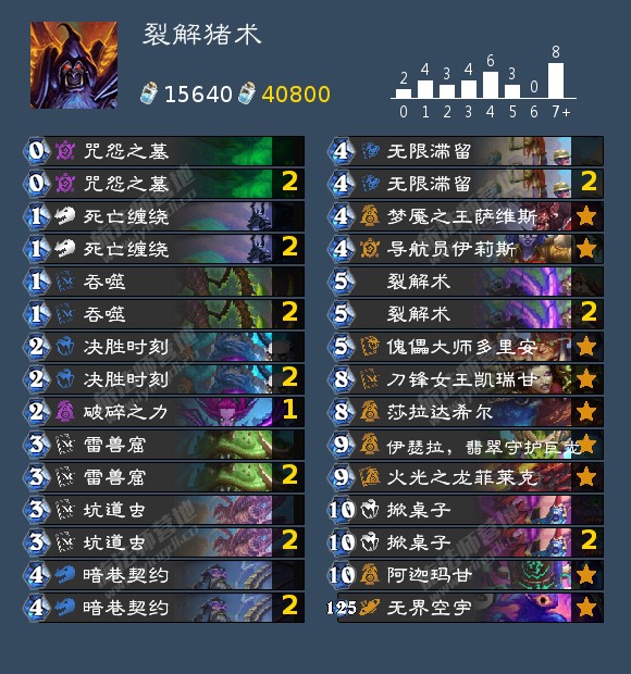 以新卡裂解术为核心,构筑的新版本傀儡猪术。高费卡除了像以前一样用傀儡大师多里安抽上来以外,还能用裂解术减费,能减到火光之龙菲莱克或者阿迦玛甘的话完全有能力把前面亏的场面打回来,只不过爆发效果想必是不会有过去的猪术那么好的,能有昔日荣光的几成水平需要打一个问号,但是这确实是少数能利用裂解术的地方了。为了能够让前期不那么空过,携带了上一次出场大概要追溯到威兹班版本的暗巷契约+决胜时刻(然而后者大概率要被优化掉)。提一嘴无界空宇,虽然看着是为了凑导航员伊利斯的费用,但是如果减费较多的话也可以直接裂解术劈了当大解用,还能留一个在手里,加倍减费的话效率还是很恐怖的。