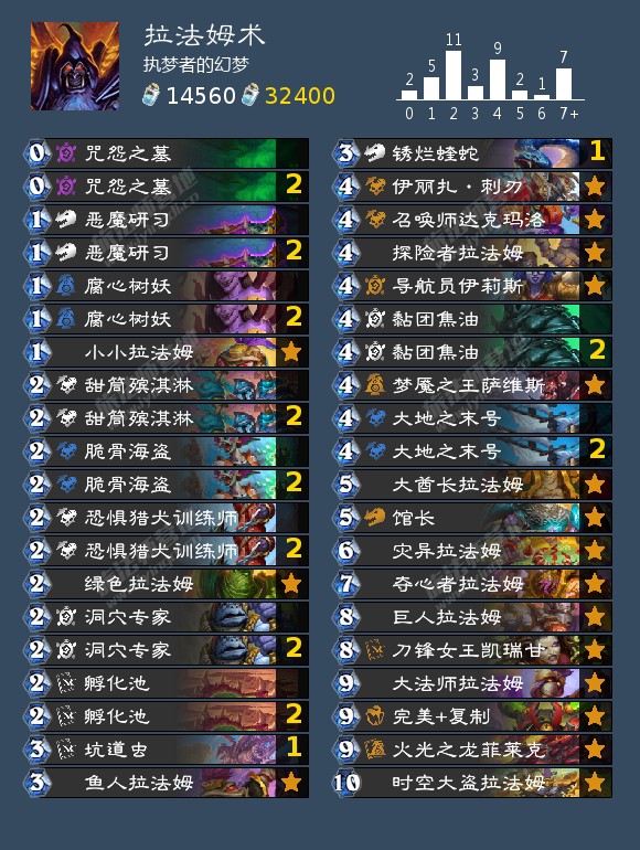看着很散很神秘的卡组,但他某种程度上尽可能利用了拉法姆的奇闻卡牌。3拉法姆填补了馆长没有优质鱼人可检索的问题,作为不太亏场面的检索来说馆长强度有目共睹;携带了不少小亡语以配合脆骨海盗,这之中也包括1拉法姆和3拉法姆两个低费亡语。同时携带了恶魔研习,除了梦魇之王萨维斯以外,6拉法姆也是恶魔,作为一张群解他也可以用恶魔研习在没有3拉法姆的情况下提前下场,腐心树妖也能某种程度上解决“起手有3拉法姆但是没有6789能配合”的问题。锈烂蝰蛇作为野兽补位,可以交易回去保证馆长多抽,但也是术士没什么好野兽能用的困境——最初我也考虑到携带雷兹迪尔以及一定浓度的延系卡牌,然而基于40的上手率问题作罢了,虽然甲虫钥匙链之类的依靠质量依然可以进入这个卡组,不过考虑到并没有什么配合,因此我没有展示。关于坑道虫的补位卡选择跳虫还是孵化池我也考虑了一会,最后选择的是能突袭的孵化池,毕竟没有buff之类的配合的话单纯的2个11作用还是太小。当然看上去这个卡组补牌浓度尚可,不携带坑道虫大概也是可行的。