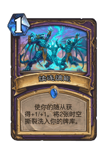 术士的1费+1+1都有一种传统:看上去他们都要比玉莲印记多一个代价,但是术士总是有将这个代价反转成收益的办法,使得他们在特定卡组中的发挥甚至好于玉莲印记,不论是现在还在弃牌术里兴风作浪的邪恶低语还是曾经黑眼术的可选卡残酷集结都是如此。续连熵能也是同系列的卡片,但是我却对他的表现怀有一点担忧:如果是去年这个时候,那他是毋庸置疑的无敌卡,但是随着自残术的鲜血树人,熔核巨人,被禁锢的恐魔这几个展开大将的离去和派对邪犬的削弱,自残术的横向展开能力是变弱了非常多的。例如,现在的顺拍,好一点的就是244 356 477,这也就3个怪,当然buff到两三个怪也绝对不算差,但是和去年那种000平铺接奇利亚斯的情况来说,还是差点味。并且相比起暮光时空跃迁者和超光子弹幕,他在“单纯的洗时空撕裂用来垫收益卡”这个方向上其实是最差的,毕竟244是超模数值,打6能解个怪的话也能接受,但是续连熵能作为buff卡,是很难接受空放的,甚至其实如果只buff一个也已经是不太能接受的情况了。因此他的存在要求我们构筑更加压低曲线,并且携带一些横向铺场卡,例如跳虫。至于奇利亚斯豪华版3000型选457自残翻倍还是735减费光环,我觉得都有说法,但是毕竟就像前面说的,现在没有爆000连着横铺的能力,因此735的减费效率是需要打一个问号的,也许前者用来替代破命之龙作为4c压力是更好的选择。