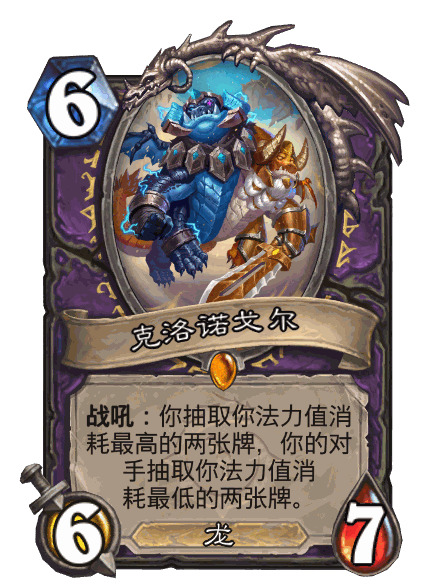 官方钦定的,时空撕裂体系的配合卡。大伙最在意的问题,毫无疑问就是,“把咒怨之墓给对面我不是亏麻了?”这个方向来说,我个人的想法是,不重要。第一,咒怨之墓的重要性上面已经陈述了,作为需要打配合的体系,不可能放弃咒怨之墓。第二,咒怨之墓是必留卡,克洛诺戈尔则不是,因此下克洛诺戈尔的时候牌库不一定还有咒怨之墓。第三,就算还有,如果你已经洗入了一定量的时空撕裂,给到咒怨之墓的可能性也不高。第四,就算真的给了一张,只要不是刚好用他找到了解牌之类的,就可以接受。最后,如果真的很怕给咒怨之墓,那么该滚的是你这家伙吧该优化掉的反而是克洛诺戈尔。作为佐证,大伙可以想想,抛开给最低不谈,最高的两张牌,我们能抽什么东西?如果是去年,那么最高的是熔核巨人,往下是被禁锢的恐魔,这就很厉害了,这两个都是可以减到0的,6费下去当回合就能拍,但现在呢?735的奇利亚斯?5费的灾毁迅疾幼龙?怎么都差点味。这样对比下来,谁的优先级高不言而喻了这个,不需要了。