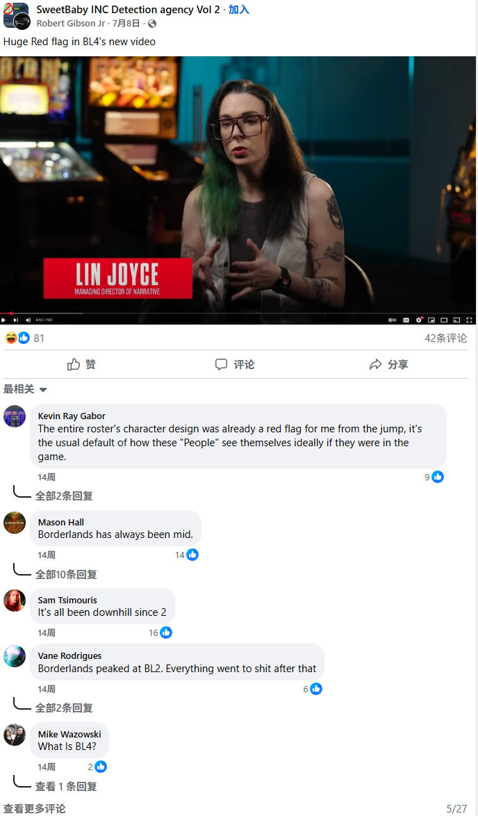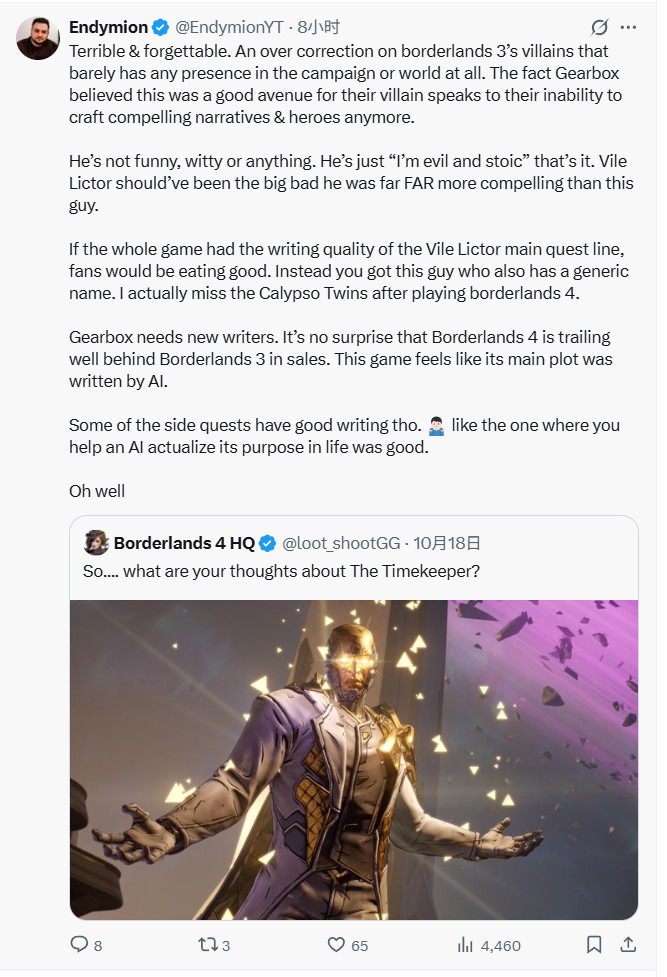 用户@EndymionYT更是借此机会批评了《无主之地4》的剧情,简直就像是AI写的:
