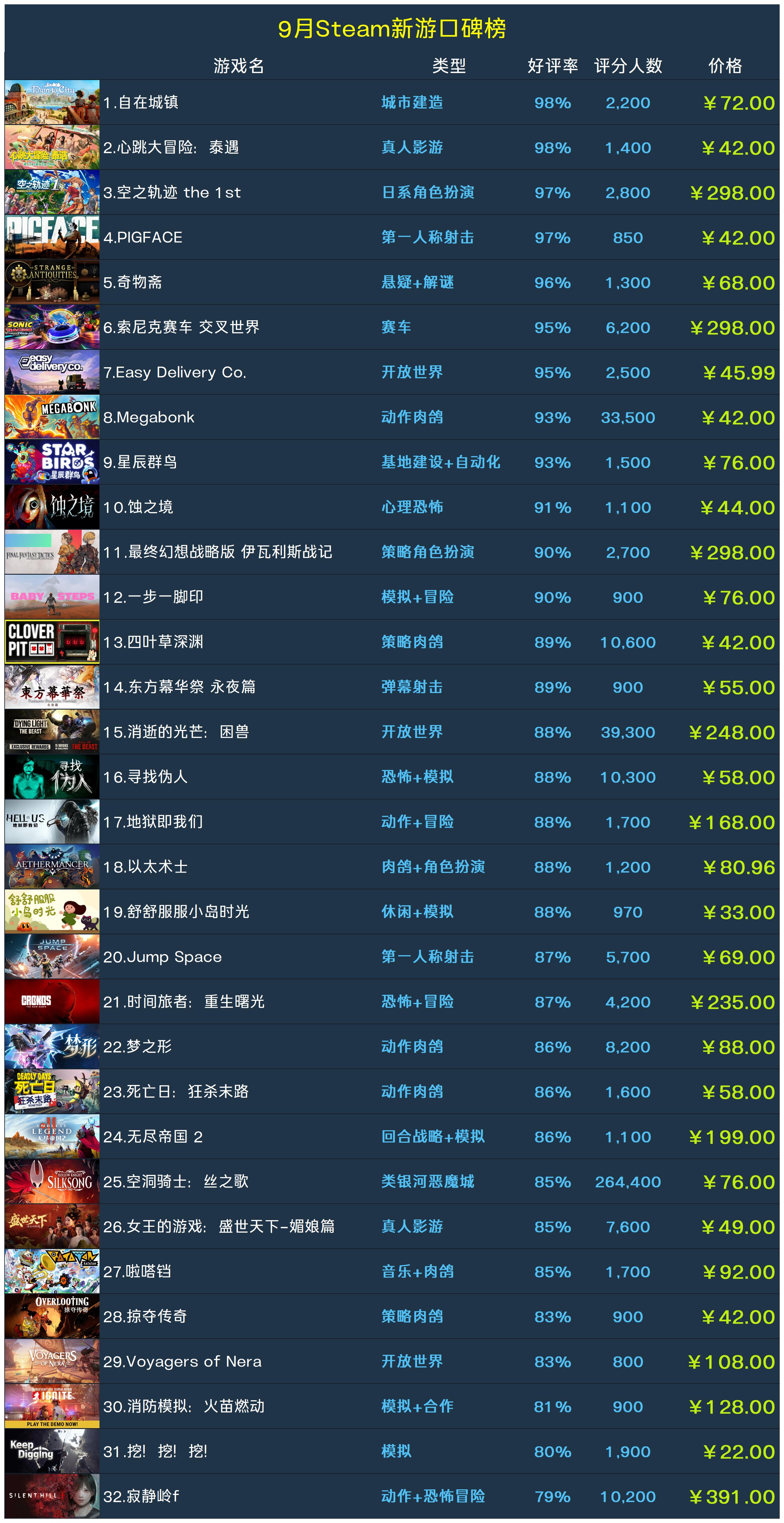 仅选取评价数≥800,且好评率≥80%,上月发售的新游戏(不包含EA转正的游戏)