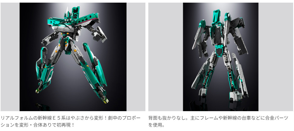 超合金魂シリーズにTVアニメ第1期の『新幹線変形ロボ シンカリオン』が登場!「シンカリオン E5(イーファイブ)はやぶさ」がラインナップ。劇中同様、先頭車と後尾車が変形・合体することでフル可動のシンカリオンモードに!