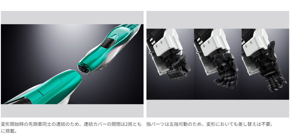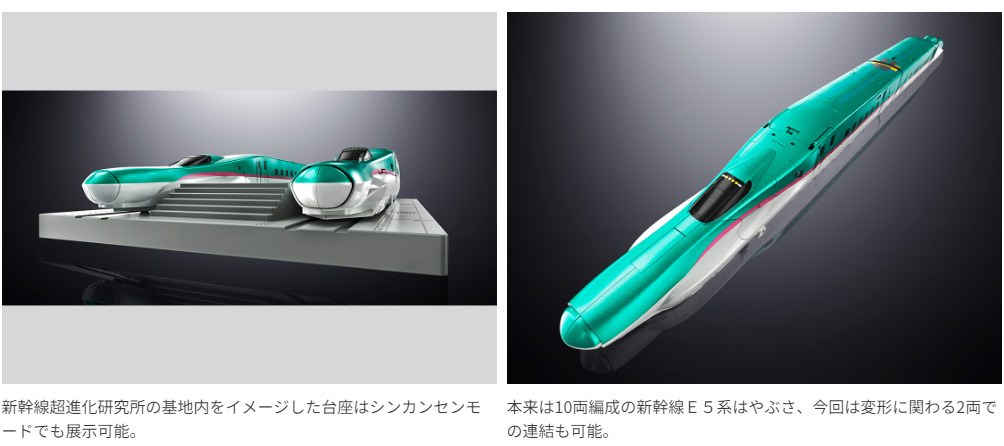 《进化利恩》粉丝期待已久的真实形态的新干线,以没有多余零件的形式变形! 超合金系列中TV动画第一季的「新干线变形机器人 进化利恩」登场!「E5 HAYABUSA」为首发阵容。与剧中相同,前端车辆和后端车辆可以变形合体成可动的进化利恩模式!