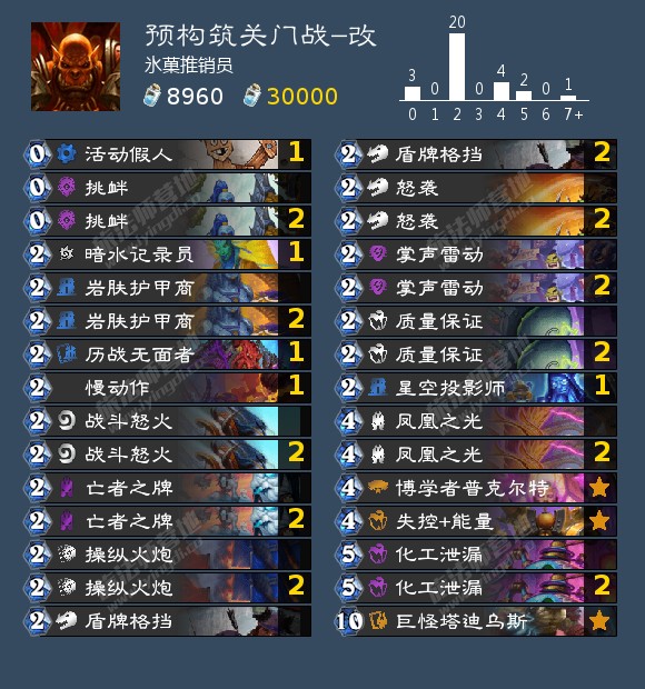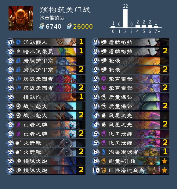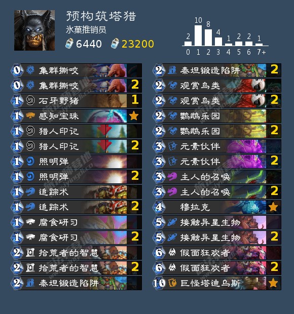 预构筑塔猎,由于笔者不玩猎人,故构筑可能很烂,在此只提供一个娱乐的思路。核心思路是标-塔-标能把穆拉克减成0,之后的香蕉也是0,小野猪无限香蕉斩杀。不是奇迹类的OTK,所需组件是鹦鹉乐园/穆拉克/石牙野猪/假面狂欢者,鹦鹉乐园提前下,4费点标最好,5费标就需要腐生研习偷1费。由于标难抽,可以考虑加一个奈丽。启动回合是6费,提前标的情况下,打出并送掉644拉出没射手的塔,打出小野猪,穆拉克然后无限食蕉就OK。