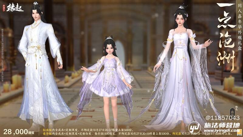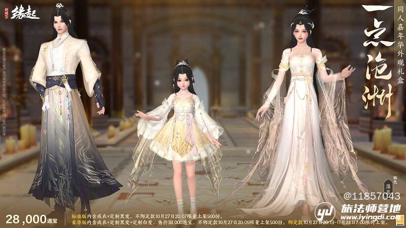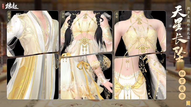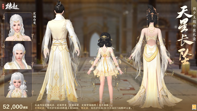 礼盒内含定制成衣、定制黑发、定制白发、定制背部挂件「日月相推」。外装以 "日月轮转" 为意,三体同承素白鎏金之制,衣间金纹星辉流淌,熠熠生辉,恍若天幕垂落。