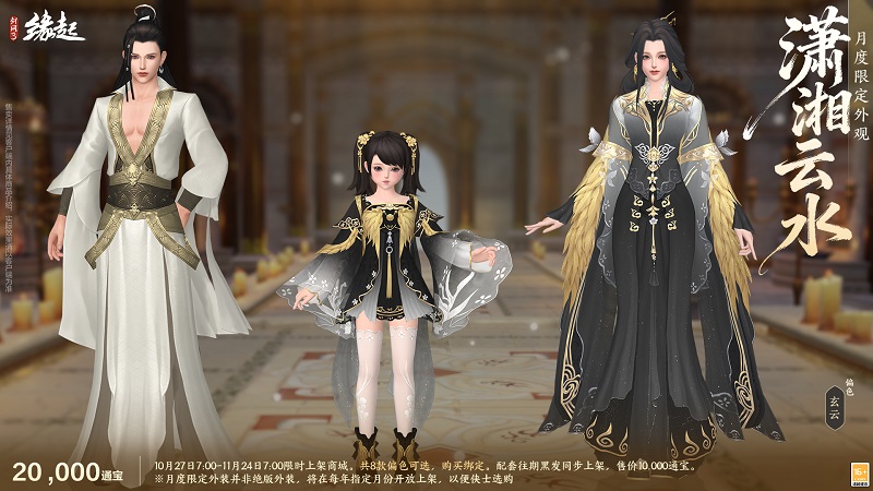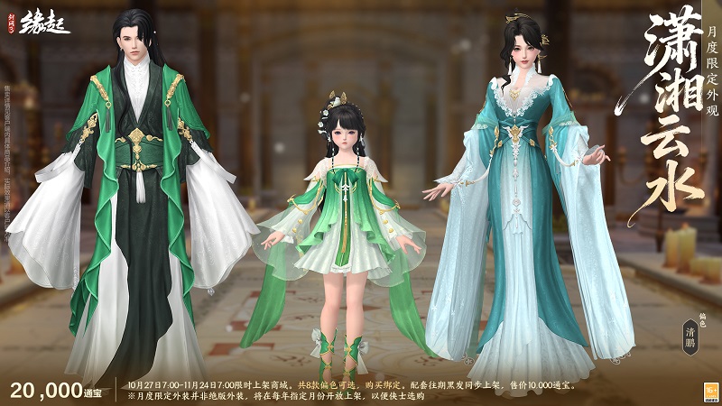 云生潇湘水接天,衣袂翩跹似流烟。月度限定外装「潇湘云水」踏云而至。外装新增千帆、清鹏偏色,尽显雅致风韵,成男、成女、萝莉款各有千秋,将山水灵秀与服饰之美巧妙融合。