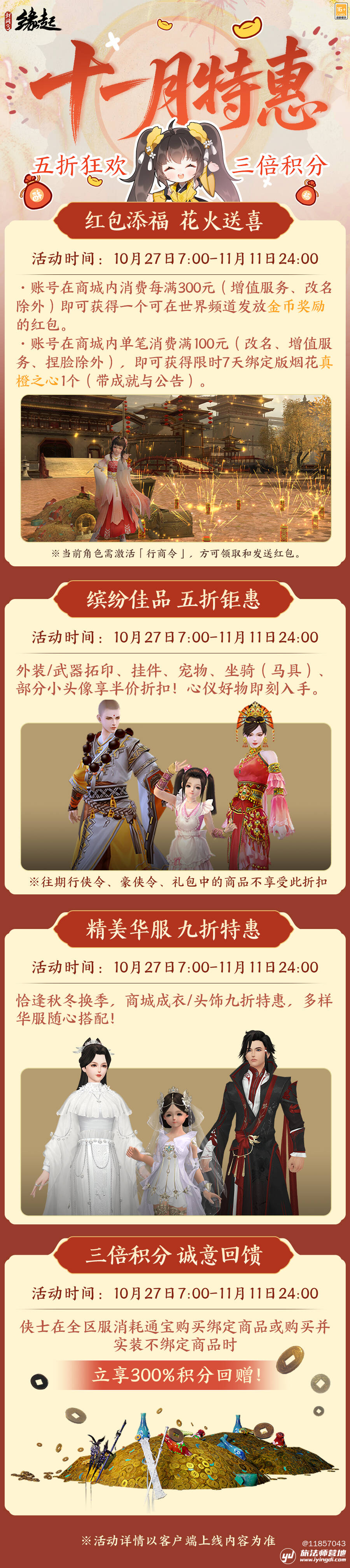 福利已就位,狂欢正当时!十一月特惠活动已备好所有诚意,活动限时开启,侠士们切勿错过,尽情享受这场江湖盛宴!