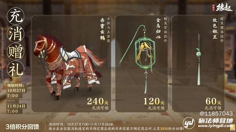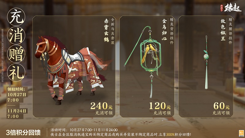 更有三倍积分回馈同步开启,10月27日7:00至11月11日24:00,侠士在全区服消耗通宝购买绑定商品,或购买并实装不绑定商品时,立享300%积分回馈,积分累积更快,兑换好物更轻松!