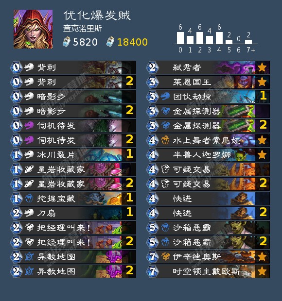 半兽人迦罗娜的奇闻套件就不带了,一是卡位不足,二是如前所述,不特化构筑的话弑君者给双方抽牌可能是负面效果,那带这套奇闻就得不偿失了。还有潜行者的其他新卡,强度不算很差,但笔者认为不足以进入节奏贼优中选优的构筑。