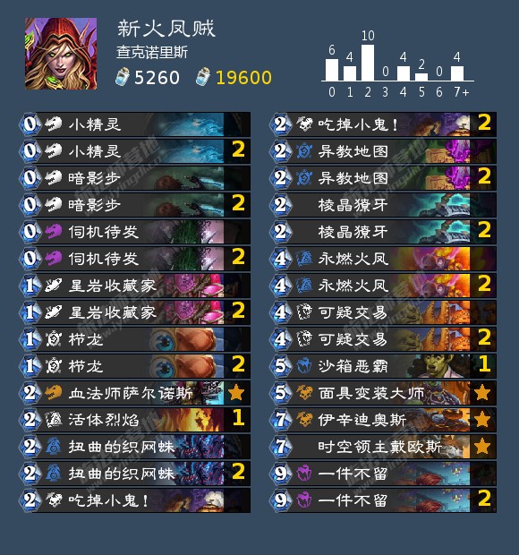 我很难说这套牌应该怎么评价,理论上,它是上限最高的爆发贼:前三回合存牌存费蓄力,4费狂刷一波牌并打出一件不留铺一地,5费沙箱,6费启动爆发组合技时牌库已经快空,7费血法增伤加抽牌直接斩杀。但,根据之前玩一件不留火凤贼的经验,无论是刷牌打出一件不留的环节还是凑齐爆发组合技的环节都不稳定,而且这个回合数卡得很死,一旦晚一回合就是每回合亏1费了。甚至,有可能栉龙弃掉组合技组件,直接崩盘。
