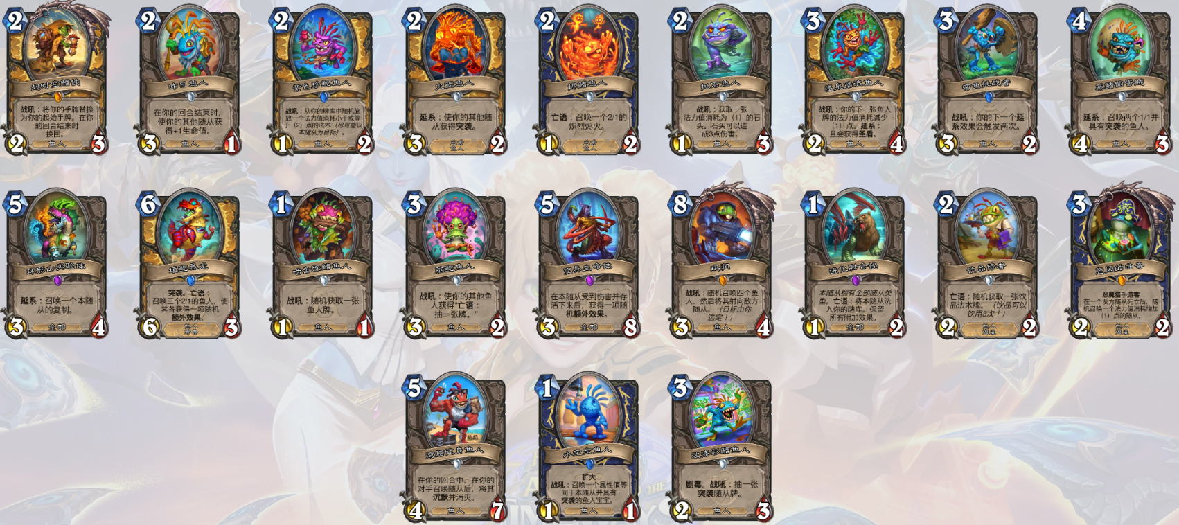 中立(仅列出出现率较高的)——梦想策划师杰弗里斯、永恒雏龙、黏团焦油、八爪按摩机、湾鳍健身鱼人(中立唯一沉默)、折纸仙鹤、折纸青蛙、折纸巨龙