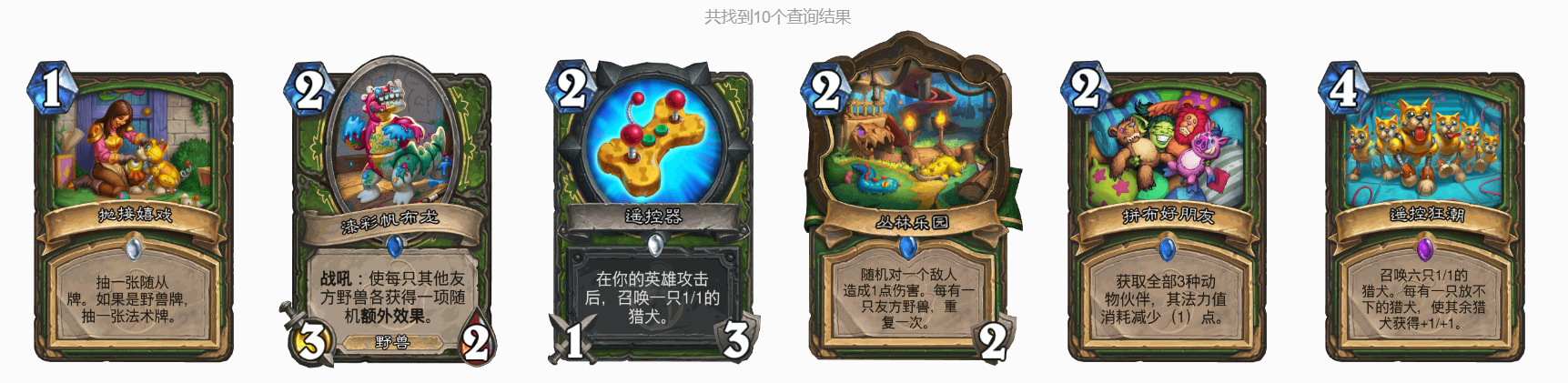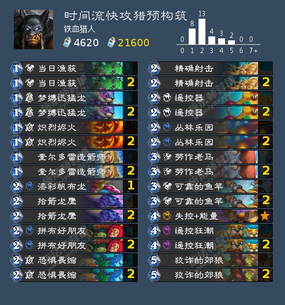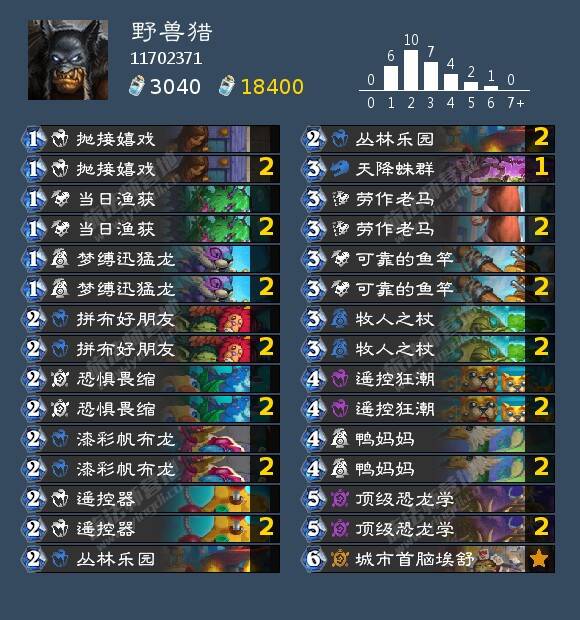 扯远了,回到正题,通过参考野兽猎,我认为新版本的快攻猎也必须带上这套强势小连招,也就是丛林乐园、遥控器、可靠的钓竿和遥控狂潮,以及拼布好伙伴。但放弃了顶级恐龙学,因为费用太高难以甩出手,不太契合龙鹰的抽牌,并且新卡113造箭师也不是野兽。然后带上快攻猎通用的低费高质量随从,比如当日渔获、梦缚迅猛龙、劳作的老马,鸭妈妈费用有点高不契合也抛弃了。牧羊杖有点占格子,生效有点慢,不好配合郊狼减费快速上场,也抛弃了。恐惧畏缩是猎人极其稀有的偷费牌,上限相当于0费打3,也很契合龙鹰打空手牌然后抽牌,也满编。那到此为止,套牌如下,还剩下4张牌: