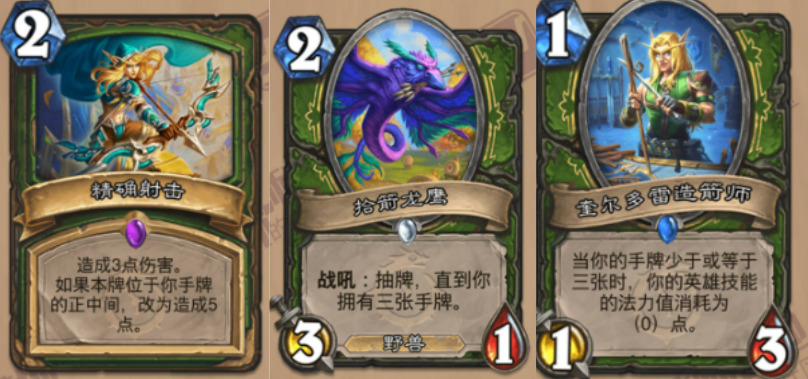 猎人的职业卡里,快攻猎的补强只有3张,分别是精确射击、拾箭龙鹰和奎尔多雷造箭师: