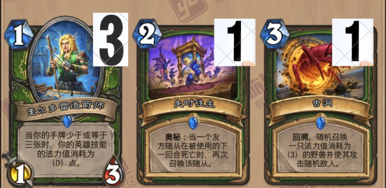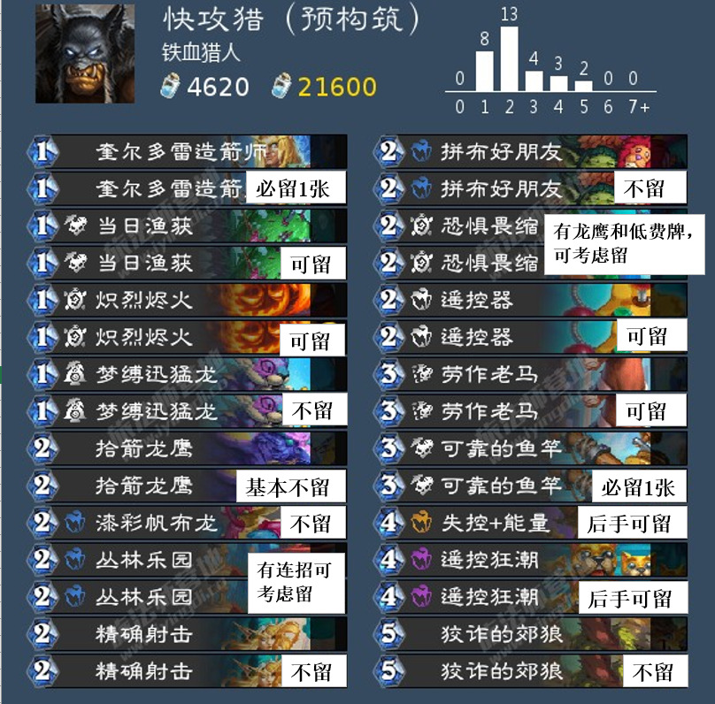 以上就是我对这套快攻猎卡组的大致打法思路,由于我玩快攻猎也不多,仅供参考。接下来是从营地大佬帖子里学来的留牌图: