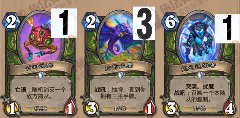 而这套连招就是3个核心:地标、招野兽的刀和4费遥控狂潮。至于5费顶级恐龙学,我认为是锦上添花的卡,如果没有前面这几张卡打出强力配合占住场面,顶级恐龙学很难出手。而野兽猎的这几张核心卡,基本都出自于威兹班的工坊: