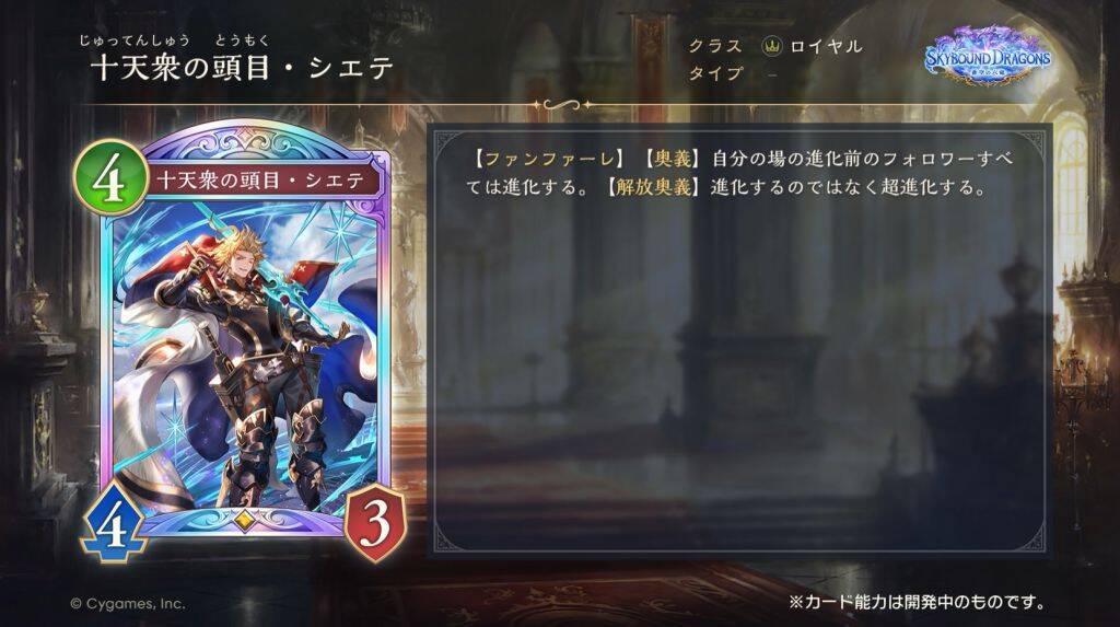 十天众统领·希耶提 皇室职业 4费4/3 【入场曲】【奥义】自己场上的进化前的从者全部进化。【解放奥义】进化改为超进化。