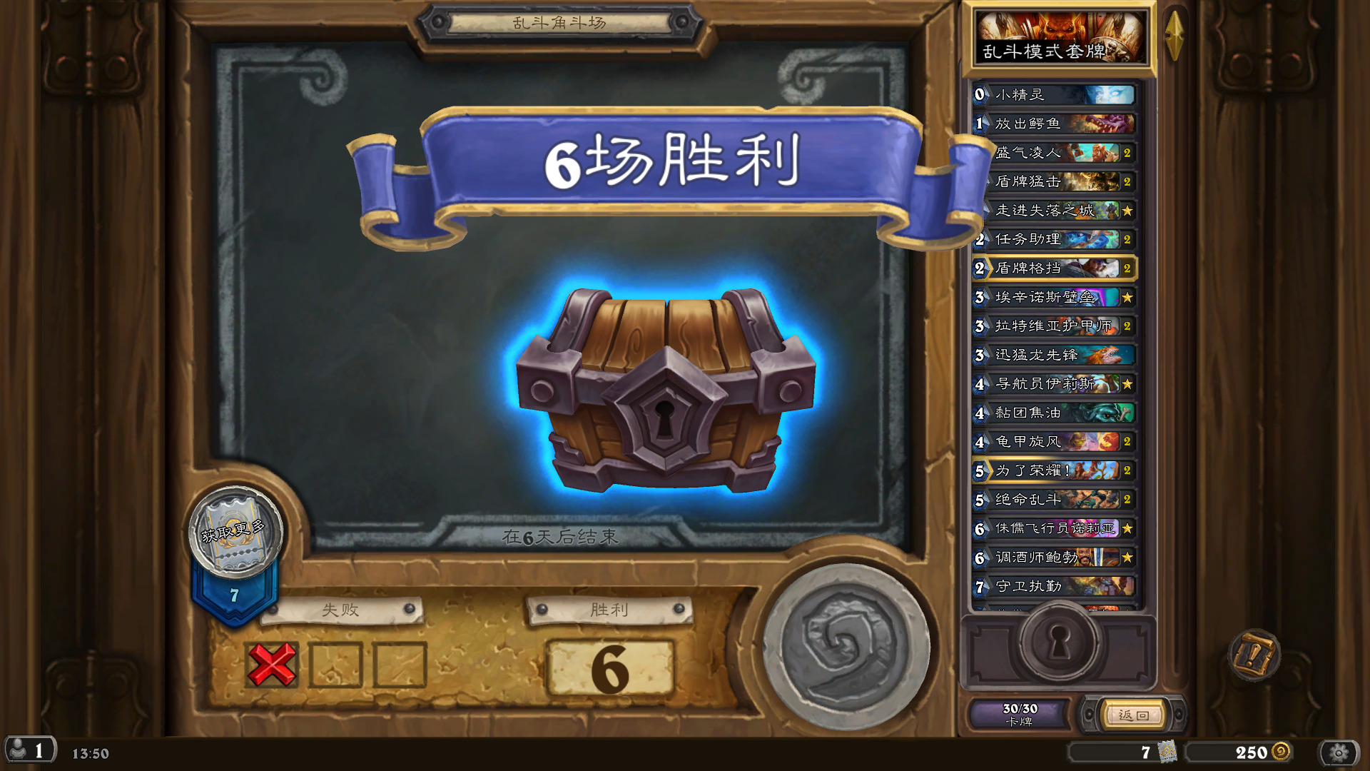低配任务战6-1 输了一把带大王的任务术,压力给的有点足。差点赢了的。还有把术士,靠德鲁伊588减费配合翻倍龙开门一脚T死了。只能说爽局,内战圣骑士的588配合开门很好用。基本两张乱斗 两张盾猛没了。嘉沃顿就是战士的爹,一只嘉沃顿T了他80血,就是解不掉~预祝大家都6胜