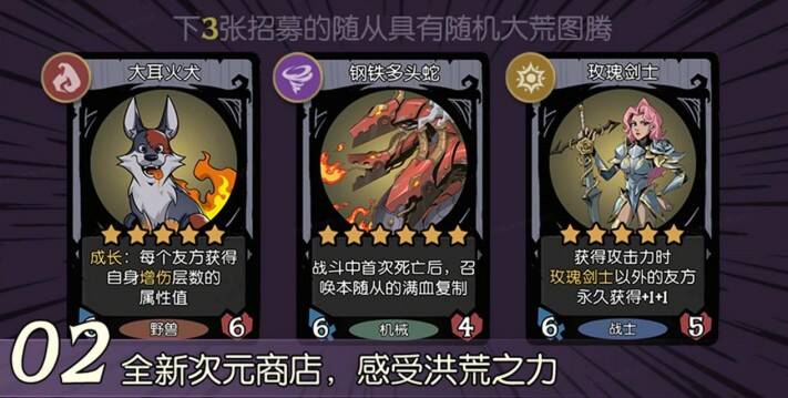 「异次元商店·大荒遗珍」同步上线,玩家在招募随从过程中,特定回合会触发异次元商店,在其中购买的随从会附带大荒图腾,带图腾的随从会具备特殊buff,使得每一次对局中的阵容构建充满变化与未知。