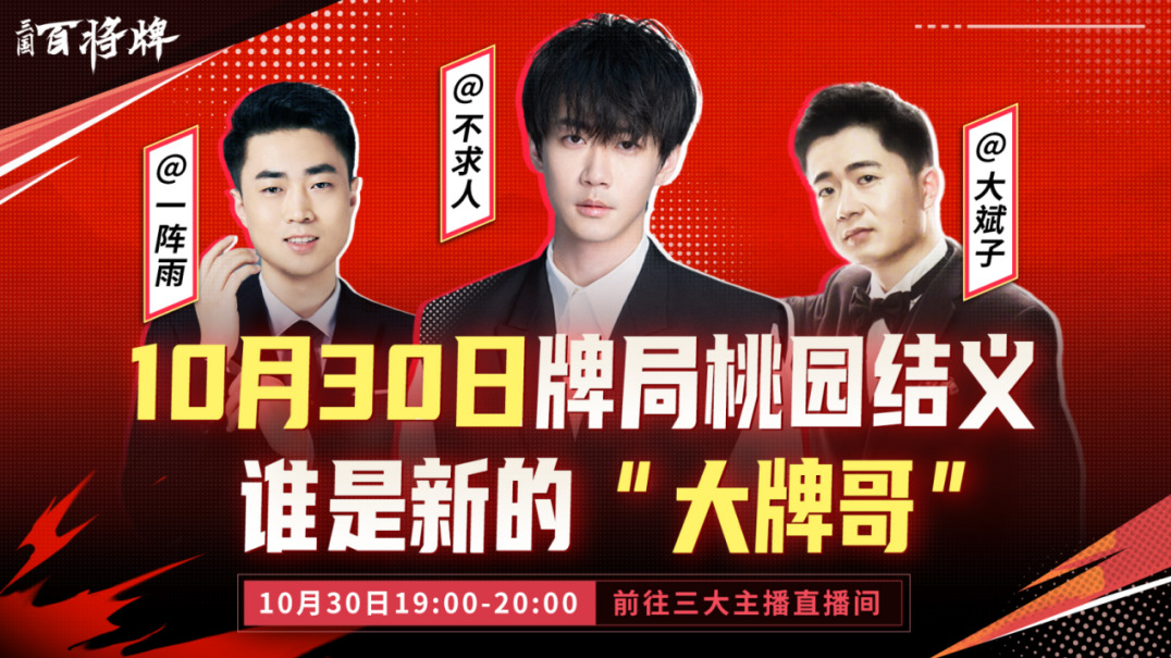 本次「牌一把」测试,顶流主播不求人竟直接撬走大斌子、一阵雨官宣下场对决,三人同台竞技,三国战局牌桌呈现,主公们可于今晚19:00-20:00前往三大主播直播间(抖音搜索主播昵称前往)见证,看看谁将是新的“大牌哥”?