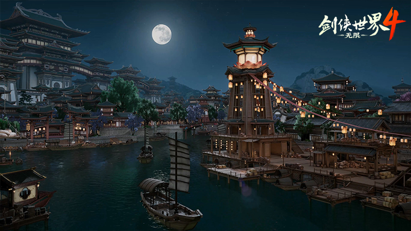 《剑侠世界4:无限》游戏中,【临安城】依水网而建,河道纵横,贯通全城,使宫阙市井既巧妙区隔又浑然一体。主城斗拱层叠,殿宇巍峨耸立,重檐直指苍穹,屋脊神兽承接天光,尽显“龙气之所钟”的皇家威仪。外城街巷则宛如一幅生动的《清明上河图》——茶楼酒旗迎风招展,商铺珠玉琳琅满目,勾栏戏台的弦乐声穿街绕巷,烟火气息漫溢坊间。临安港更是还原了“万舸骈集”的盛况:港口帆樯如林,舟船织网,南来北往的货物与传奇随波流转,谱写出南宋水城繁华不息的篇章。