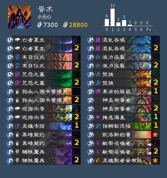 玩过弃牌术的玩家可能会发现一些问题,可以天胡(后手3费斩杀等)的对局往往手牌并不多,这并不是偶然现象,不要把玛克扎尔小鬼等续航看的过于重要,一些没有配合的情况,有狗头人图书管理员的情况下建议换掉玛克扎尔小鬼,邪恶低语+蜘蛛蛋建议多留,你会发现只要打出来,对手会死的特别快。而过期货物专卖商+蜘蛛蛋或者+行尸或者镀银魔像在这套里不建议多留,带了蝙蝠和牛塞,满编暗石守卫的情况下很容易导致专卖商被卡住。