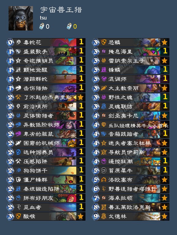 兽王体系提供可靠终端,在手上同时有苔原犀牛,海卓拉顿和戈德林时,拍出兽王即可达成高达44-50点的斩杀,即使野兽不全,也能提供十几到二十几点斩杀,实战中自己多多计算。