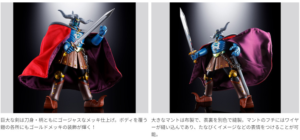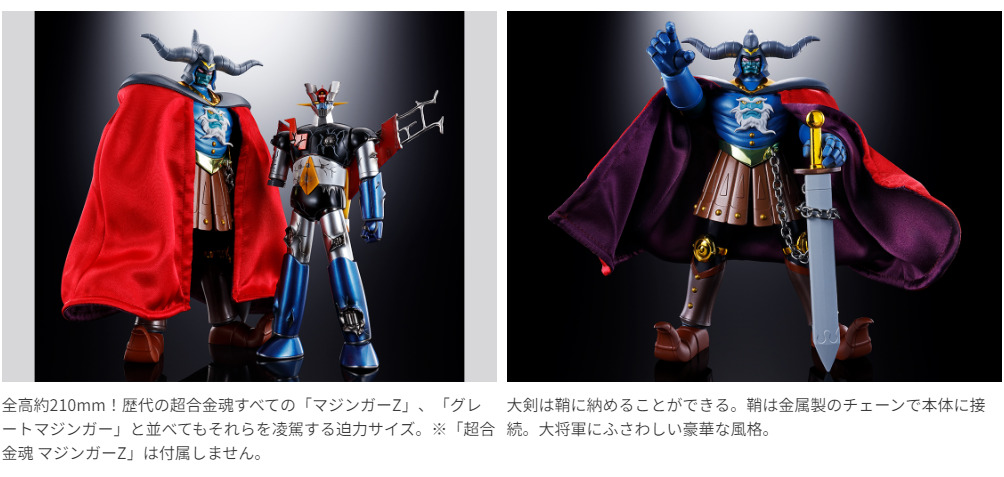 マジンガーシリーズ最強の敵キャラクター「暗黒大将軍」がファン待望の超合金魂化。マントはワイヤー入りの布パーツで再現。剣や鎧の装飾部などに豪華なメッキパーツを使用。