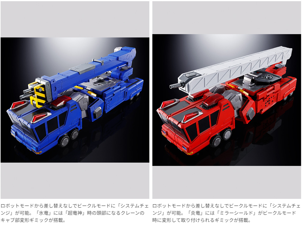 『勇者王ガオガイガー』より「超竜神」が超合金魂に登場!左右の半身を構成する「氷竜」「炎竜」のビークルからロボットへの「システムチェンジ」そして「シンメトリカルドッキング」までの変形合体ギミックを搭載!