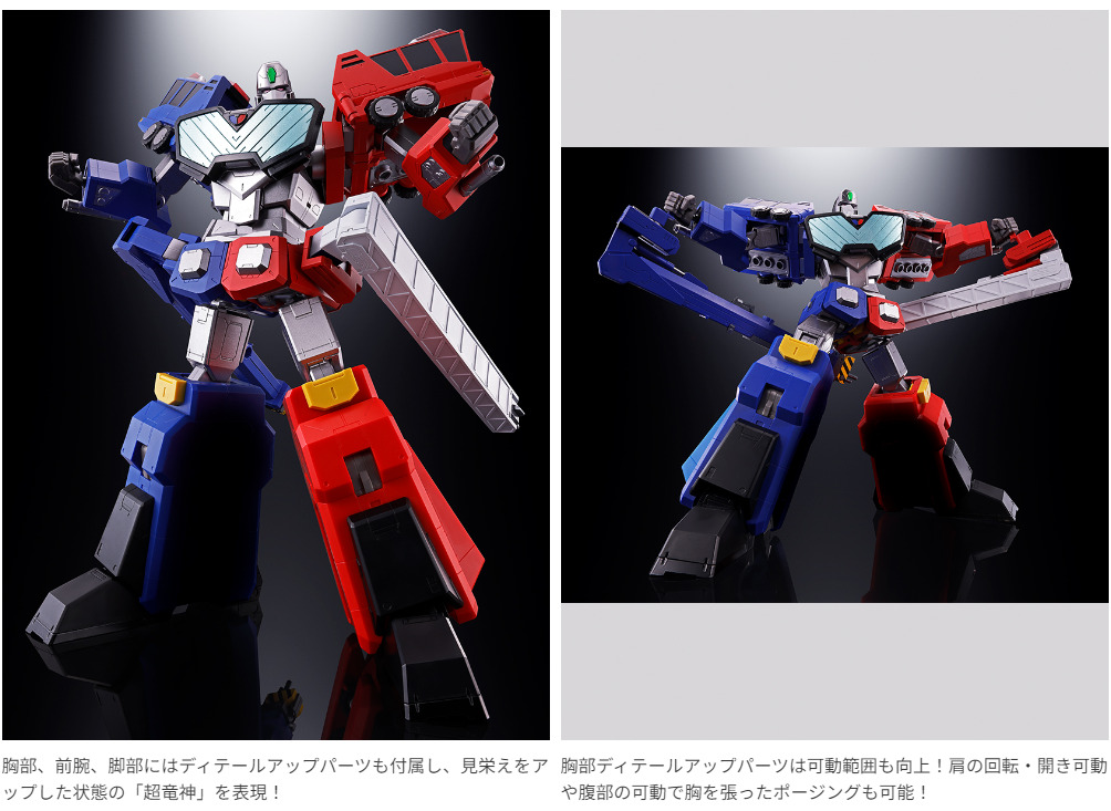 超合金魂で「超竜神」が完全変形合体仕様で登場!「氷竜」「炎竜」のビークルからロボットへの「システムチェンジ」と可動を両立しつつ、更に2体の「シンメトリカルドッキング」の再現!可動と見栄え再現用にディテールアップパーツが付属するほか、大型武器の「イレイザーヘッド」も付属!