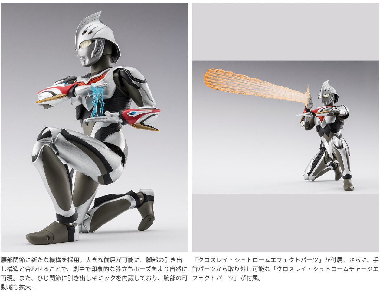 円谷プロダクション造形部門LSS徹底監修のもと立体化。劇中のプロポーションを崩すことなく、S.H.Figuarts準拠の広い可動域により、様々なアクションポーズを再現可能。新機構によって向上した可動域を体感せよ!さらに「クロスレイ・シュトロームエフェクトパーツ」に加え「クロスレイ・シュトロームチャージエフェクトパーツ」が付属!