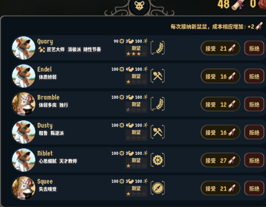 在每个场景下,首批前往的船员分配也有所不同,但无论如何搭配,5名首发船员都会囊括矿工、农夫、探险家和工程师这4个公会的成员。每个公会都有不同的特性,矿工公会的鼠鼠们有着搬运量+1的加成,同时也因此每餐需要多消耗一份食物;农夫公会的鼠鼠在田野中的移动速度会更快,但是非常讨厌生食;探险家公会的鼠鼠不仅天生耐寒还不会因为地形而减速;工程师公会的鼠鼠可以让工业机器磨损减缓。通过特性对鼠鼠们的工作进行合理的分工,可以达到事半功倍的效果。