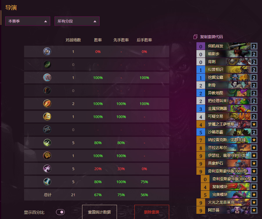 本人从钻10左右开打,十一星20把66胜率上传,卡组和战绩如下。