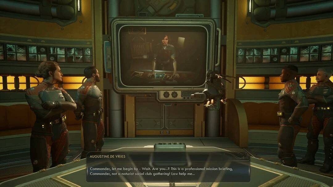另一个例子是地球理事会的奥古斯丁・德弗里斯(Augustine de Vries),她会斥责你:“参加专业任务简报会,却穿得像要去裸体主义者社交俱乐部聚会似的”。游戏后期可能还有更多类似场景!