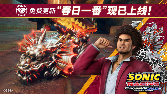 世嘉宣布,热销中的《索尼克赛车 交叉世界》今日正式推出免费更新“春日一番(《人中之龙》)”。此外,限时联动活动——“春日一番 活动”将在11月7日举办,活动期间内收集活动点数,可获得联动活动限定的游戏内道具。