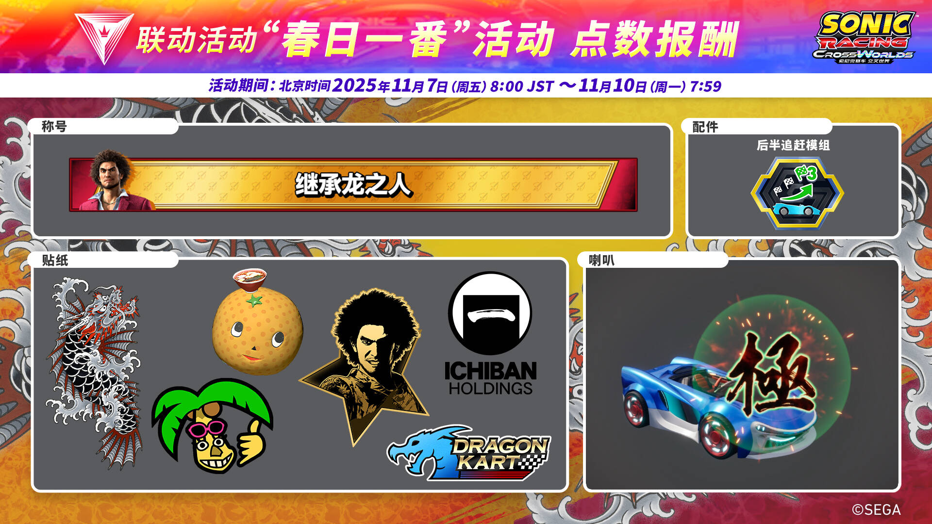 《索尼克赛车 交叉世界》免费更新“春日一番”今日正式上线!限时活动“人中之龙 春日一番 活动”11月7日开启
