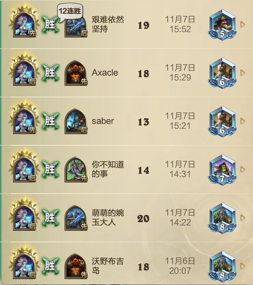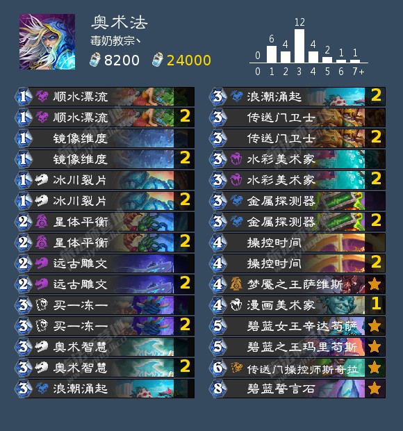 于是根据自己的理解先搭建了一个构筑底子,经过三次迭代和两次优化之后拿到了一个不错的十二连胜战绩,先放卡组在这里,希望可以和大家一起研究新版本法师的出路。