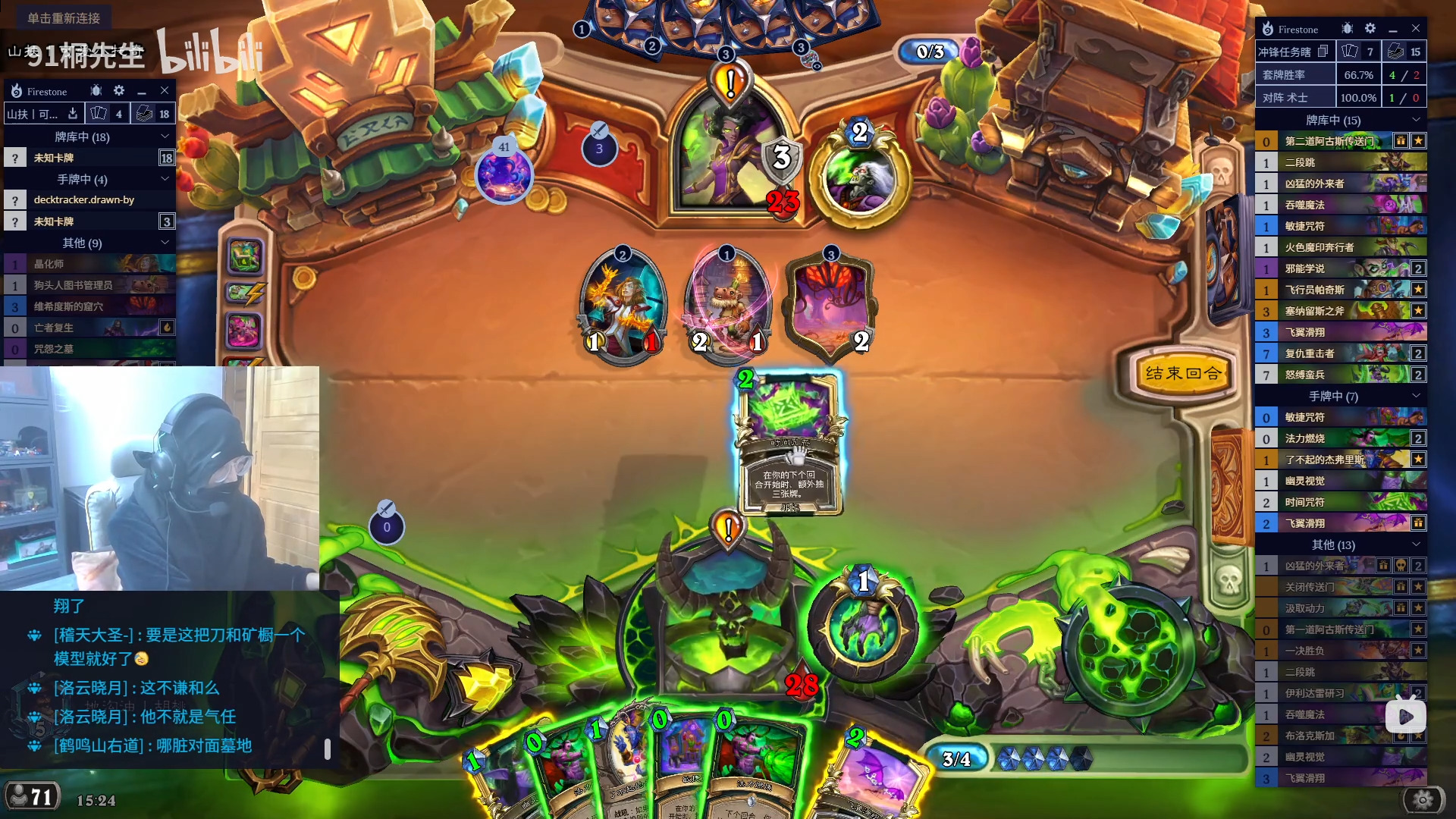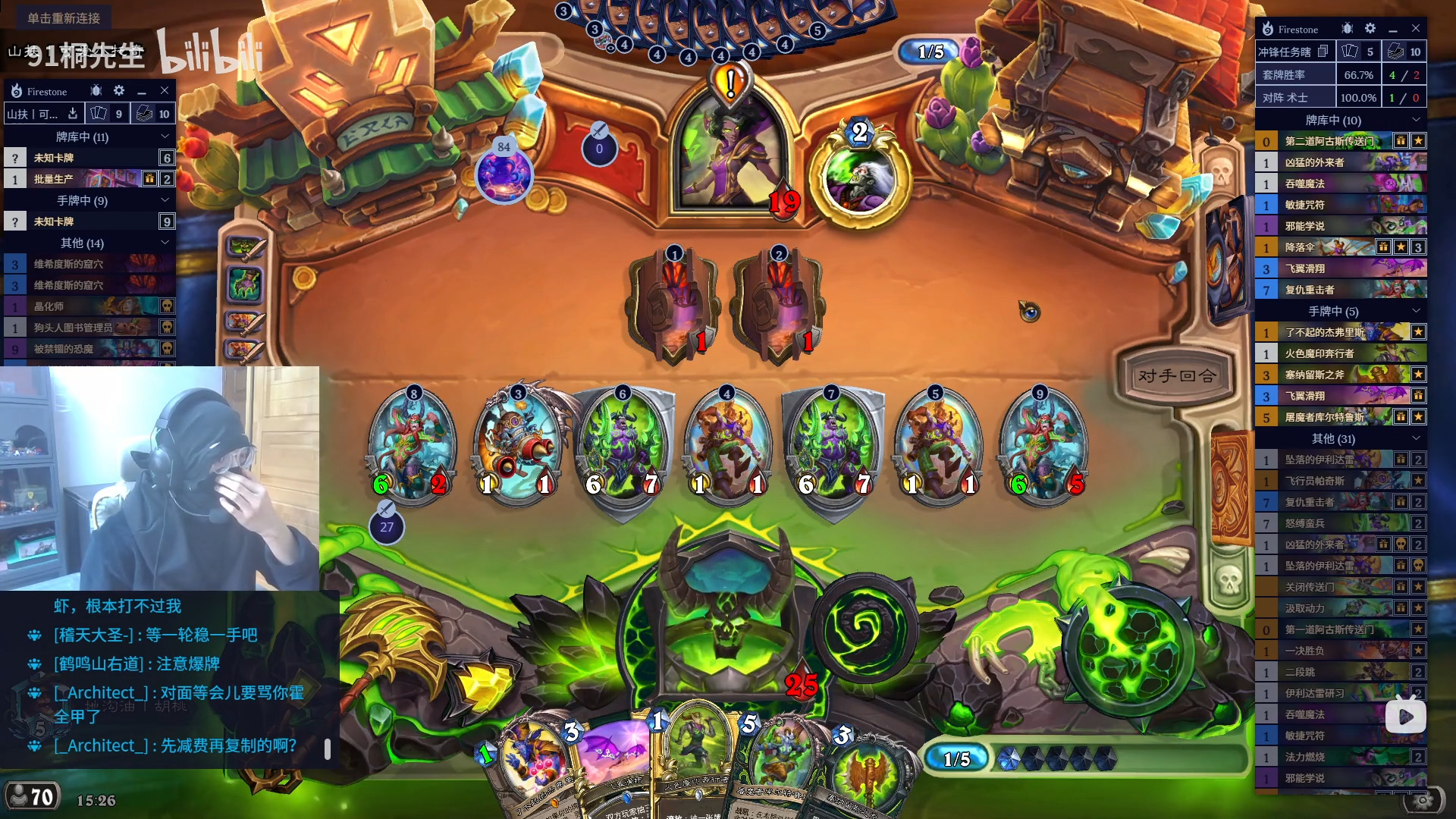 法力燃烧的运用也需要一定的熟练度,打宇宙卡组时,如果你没有吞噬魔法,则需要预防性的卡住对面的锋鳞,或者当你做出场面时,你要卡住对面的解牌(在这里顺便提一嘴吞噬魔法,当你任务进度差1的时候,就没必要去贪沉默特效怪的问题了,能做任务就直接做,打弃牌术沉默肚子里有灵魂弹幕的过期货物专卖商的优先级是最高的!其次是马克扎尔小鬼和小鬼骑士)。在面对术士这种解牌代价非常低的卡组时,你要学会存法力燃烧,将两个法力燃烧一起打出!例如这把打气宗术的对局,前几个回合我没做出场面,但是我摸到了法力燃烧,因为气宗术卡组性质的原因,所以不用着急去打法力燃烧,此时唯一的选择是挂上时间咒符而不是去赌飞翼滑翔!等到下个回合的超展开+双锁直接叫杀!