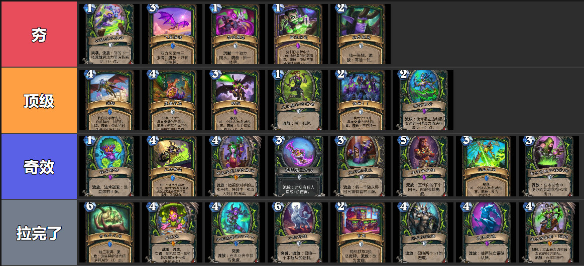 接下来是吞噬魔法和伊利达雷研习的问题,这两张卡放在一起讲是有原因的。先聊吞噬魔法,很多人觉得吞噬魔法带一张就够了,我的评价是还是欠光速牧和弃牌术的收拾了,吞噬魔法还要用来处理锋鳞和过墙。其实和滑翔的观点是差不多的,你打少部分本来就不是很优势的对局,你去一张吞噬魔法并不会为你的胜率带来多大变化,但是你打大部分对局,吞噬魔法会给你创造非常大的帮助。再聊聊伊利达雷研习,尽管现在的流放牌越做越烂 ,但实际去认真看一下卡池,27张牌中完全无用的烂牌只占了三分之一 。而且研习的存费以及吃到前两阶段减费后做出来的偷费,都是不可忽视的强大效果,所以我对研习的观点是,无论什么环境都得带两张!!!