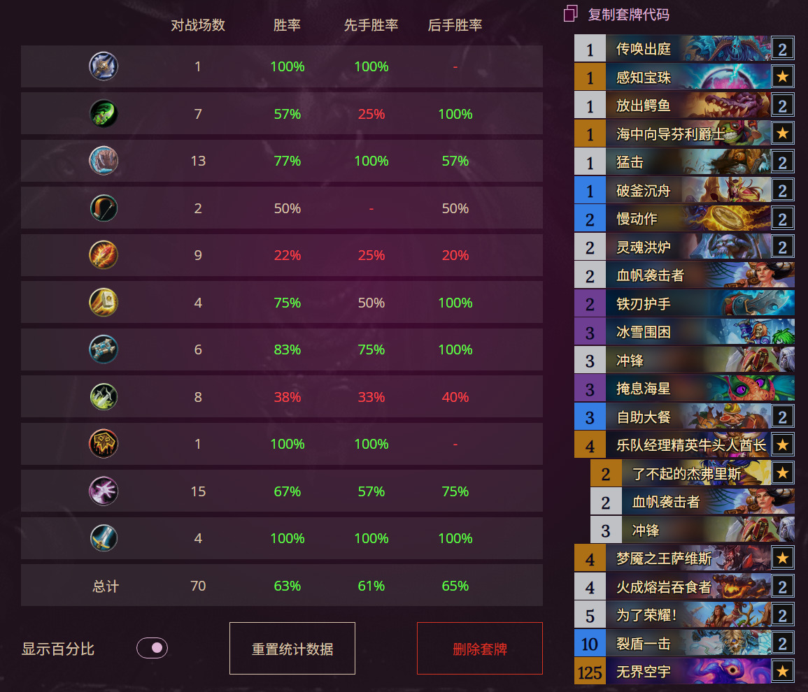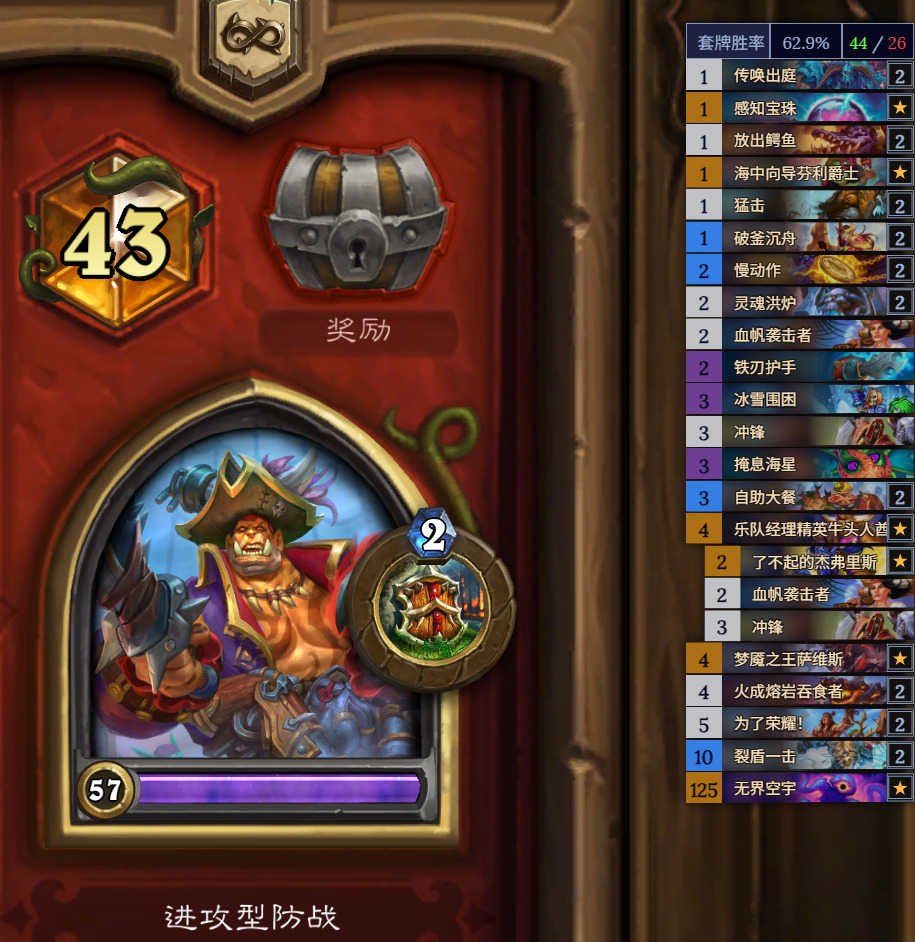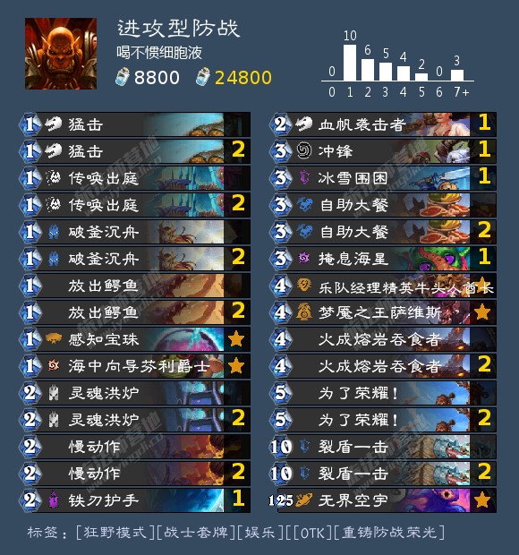 先说一下这套卡组的获胜方式:靠各种方式叠125甲后提铁刃护手+血帆袭击者+冲锋,或者打快攻叠125甲,对面直接就跑了,所以这套卡组本质上算是半套防战、半套OTK。得益于现在的赛马场环境,环境中没有什么控制卡组,也没有什么破坏手段,所以这卡组才能有这样的强度。但这也是更加可以看出,狂野没有小丑卡组,只要适合环境,地沟油也会很有强度。