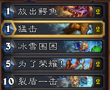 然后再分析一下卡组中的解场苟活体系,新版本的放出鳄鱼和为了荣耀无疑是相当好的增强了战士的润滑体系。但鳄鱼并不能做到完全作为凝冰护盾的上位替代,比如手牌中没有裂盾一击,交放出鳄鱼后用为了荣耀找裂盾一击就比较有风险,没找到的话,就比冰盾要伤。所以实战中很多时候,只要没有很强的生命危险,都应该避免强行找裂盾一击,宁可用2费的为了荣耀先过,稳一手,也不要盲目鳄鱼加0费为了荣耀。相信老防战都明白战士历来便是以血量换卡差,所以有时候手上有1+10也不会选择解场。因为我们的血量根本不重要,只要不死就行,125甲已经在路上了。