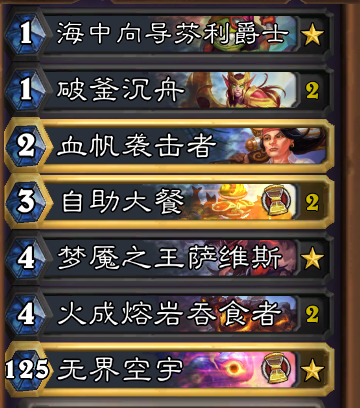 通过极限压缩套牌内随从数量,以便自助大餐抽出芬利和萨维斯,然后萨维斯找空宇,芬利再洗进牌库。
