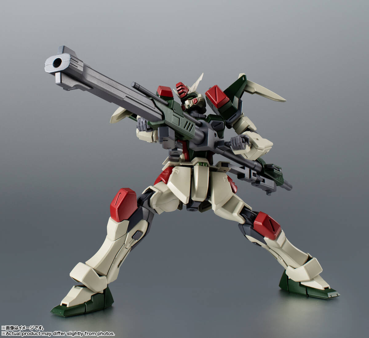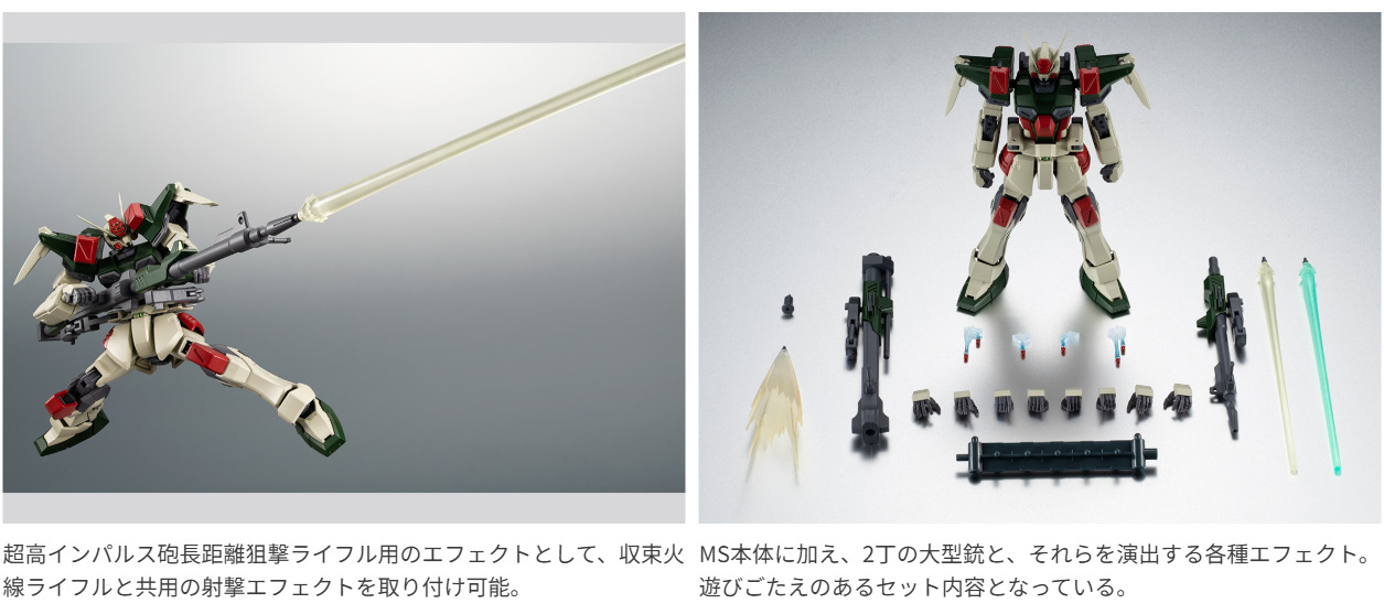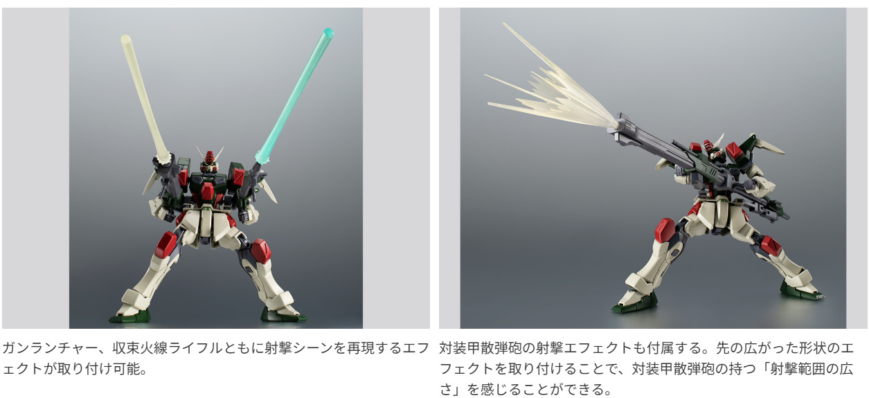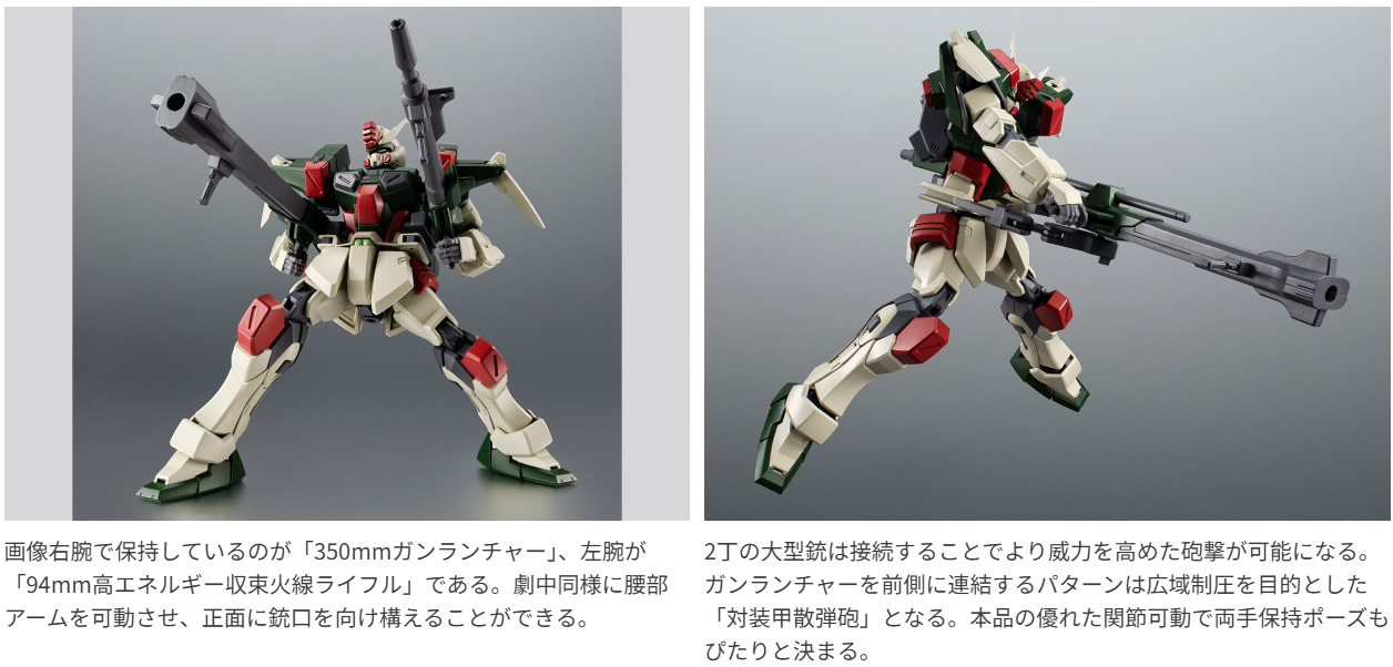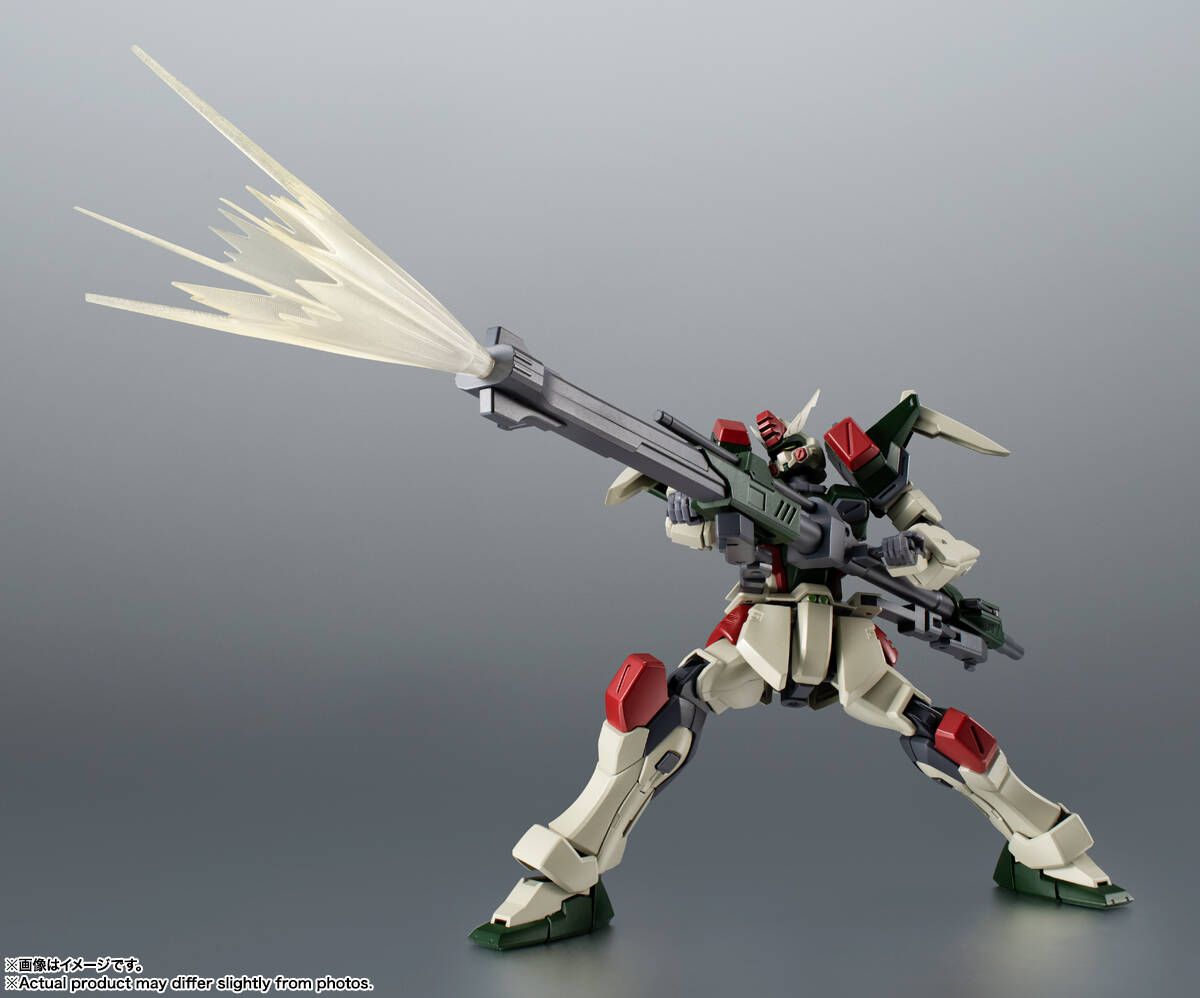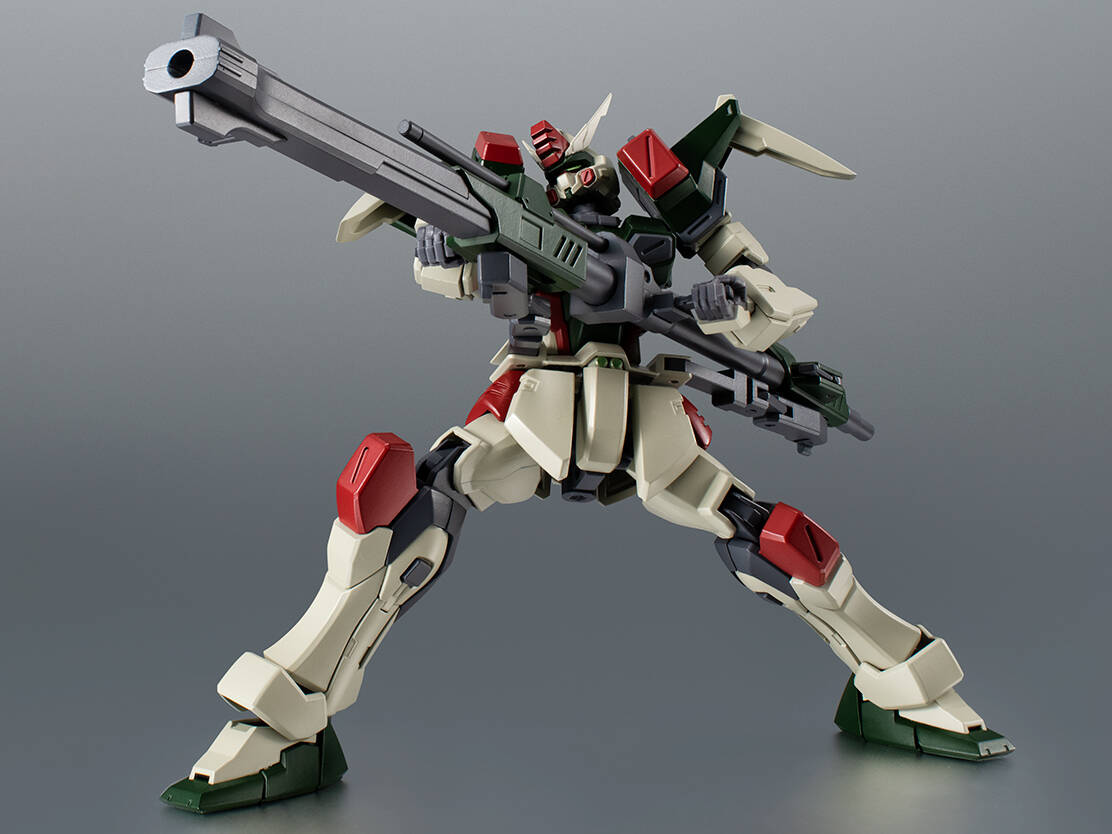 地球連合軍が開発した5機のG兵器のうち、遠距離砲撃戦に特化したガンダム。パイロットはザフト軍のディアッカ・エルスマン。350mmガンランチャーと94mm高エネルギー収束火線ライフルの2丁の大型銃は、戦局によって連結可能で高威力の大型砲として運用可能。ROBOT魂でもこのギミックを再現!各砲やミサイルなどのエフェクトパーツも豊富に揃っている。