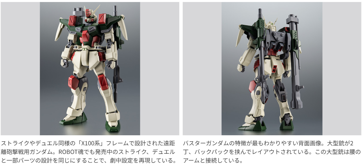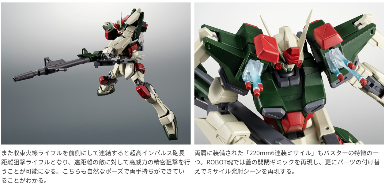 ROBOT魂 ver. A.N.I.M.E.『機動戦士ガンダムSEED』で「バスターガンダム」が登場!遂に初期5機のガンダムが勢揃いする。MS本体からアームで接続する2丁の大型銃の連結ギミックや豊富なエフェクトなど見どころの多いアイテム!