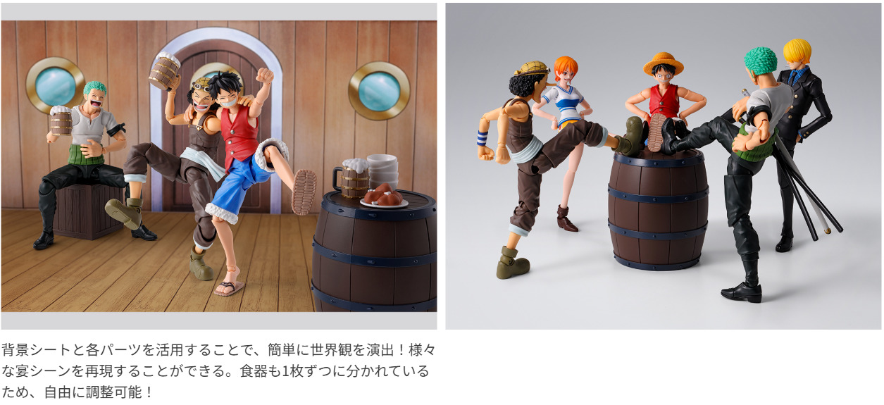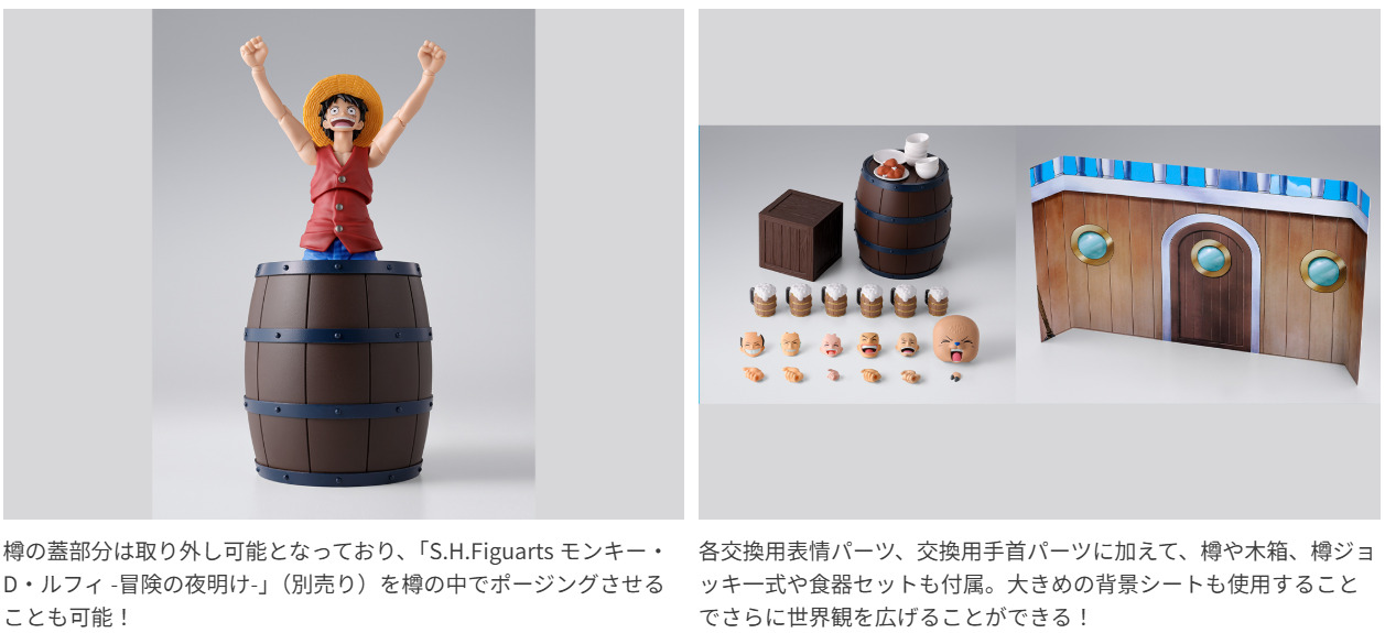 宴シーンを再現して遊べるオプションパーツセットが、S.H.Figuartsに登場。別売りのS.H.Figuarts 冒険の夜明け・ドラム島シリーズ(計6キャラ)に使える、宴時の笑顔はじける各交換用表情パーツ、樽ジョッキを持つことができる各交換用手首パーツが付属。さらに樽や木箱、食器セットや背景シートも付属し、アニメの中の世界観を再現可能!