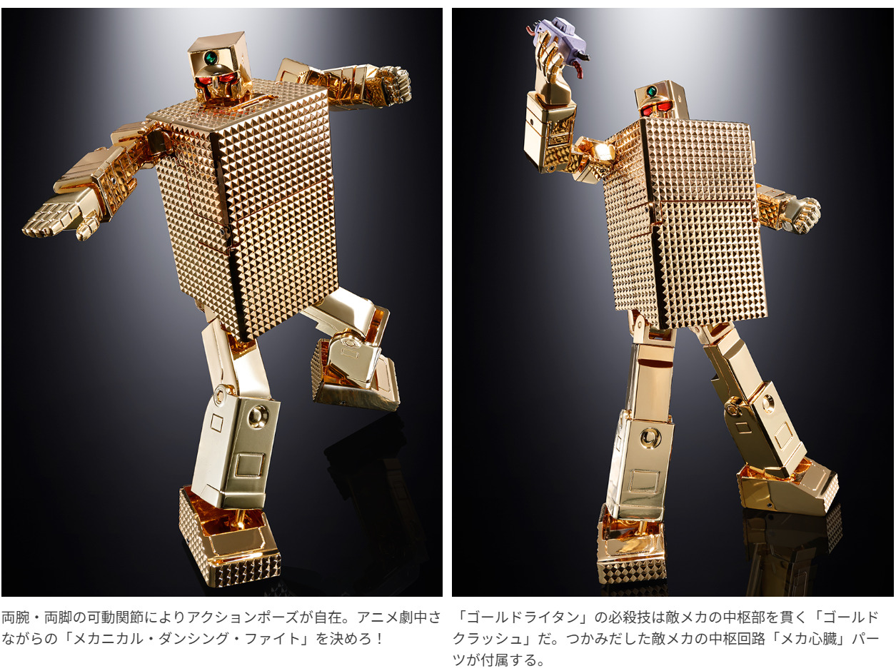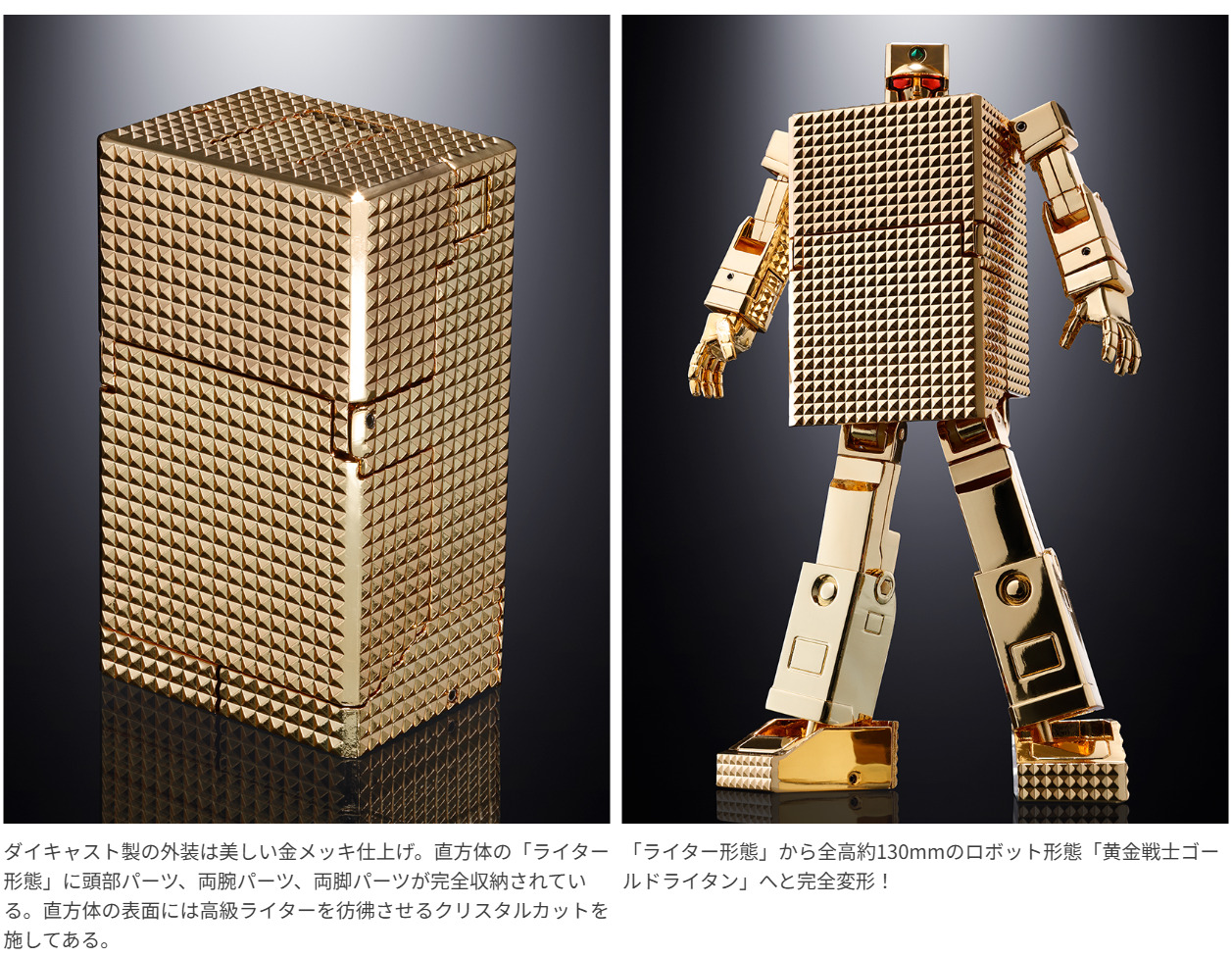 超合金50周年記念アイテムとしてまばゆい金色のボディの「黄金戦士ゴールドライタン」をリニューアル!ポピーの超合金パッケージをオマージュしたデザインの特製収納BOXが付属。