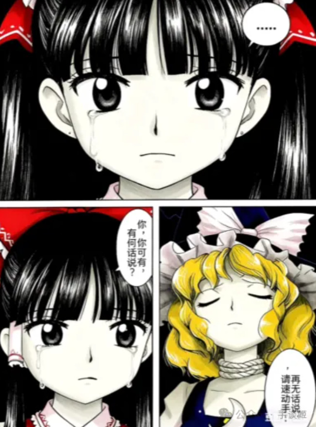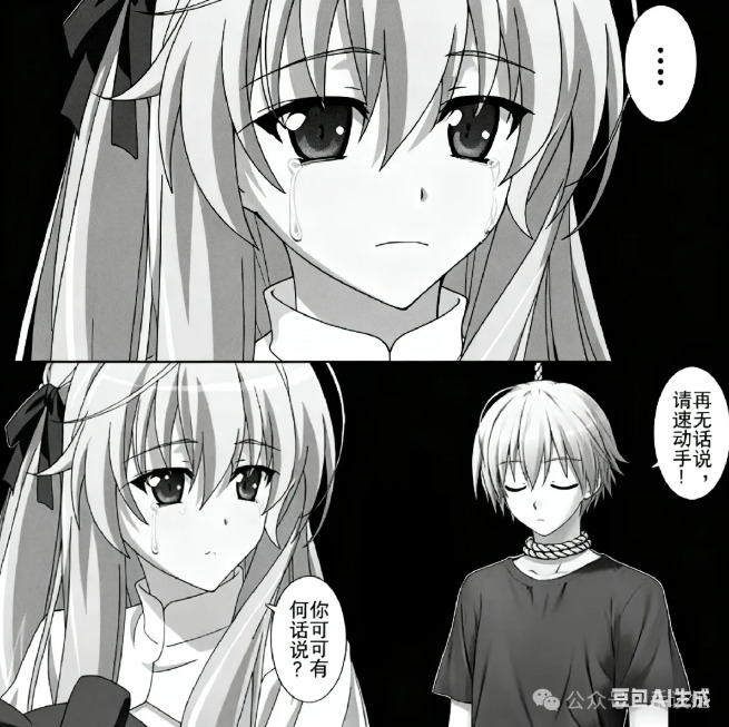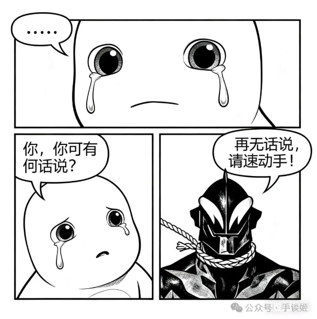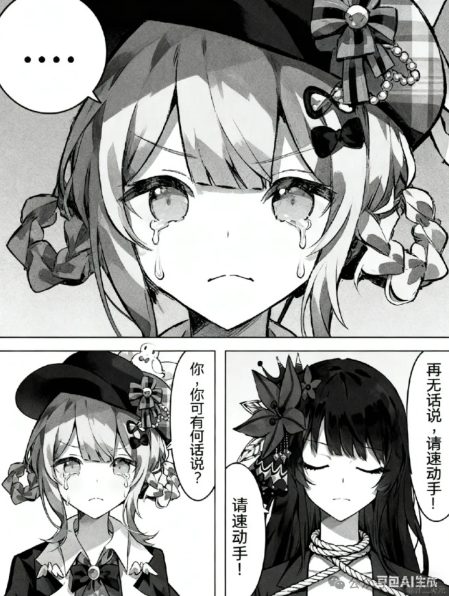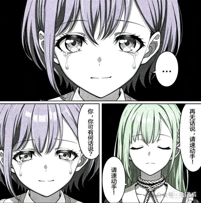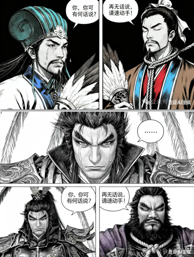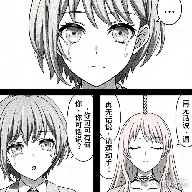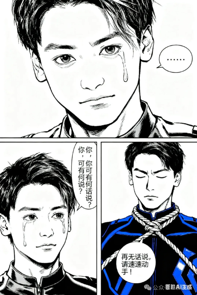 做一个三格漫画,最上边一行一格,下面一行左右两格。最上方格由第一张图的角色作为主角,角色流着眼泪,嘴巴却紧闭,幽怨地盯着镜头,对话框内:“……”。左下角的第二格依然由第一张图的角色作为主角,角色悔恨地流着眼泪,哭泣着询问:“你,你可有何话说?”。右下角的第三格由第二张图的角色作为主角,角色带着决绝的表情,有一根绳子从上方系在他的脖子上,他闭着眼神情庄重地回复道:“再无话说,请速动手!”,整体采用黑白画风,所有对话发生在对话框内,无重复内容,所有镜头以近身特写的方式表现,注意每格内的角色,我再次重复一遍,前两格为我发送的第一张图的角色,最后一格为我发送的第二张图的角色。