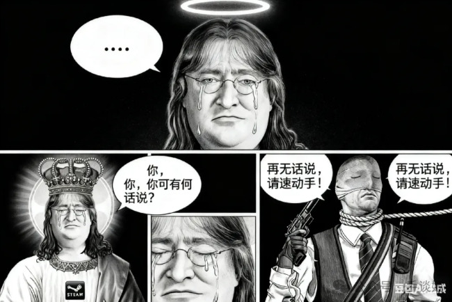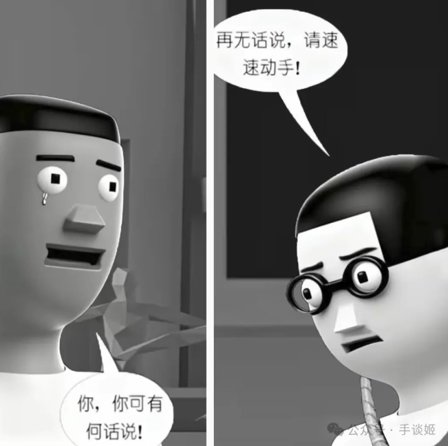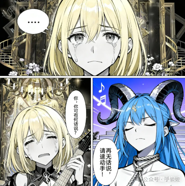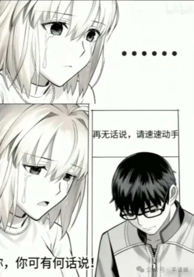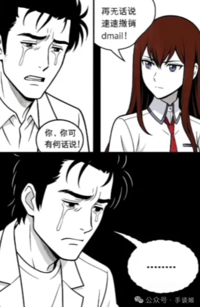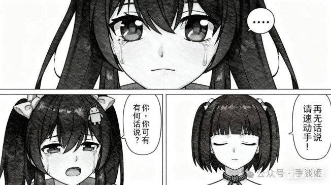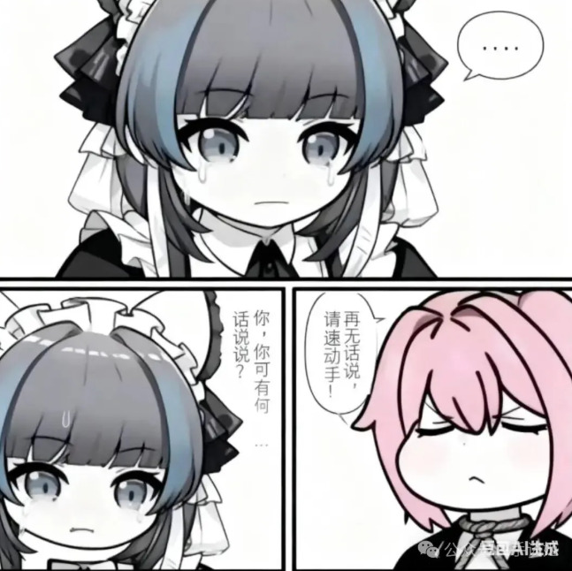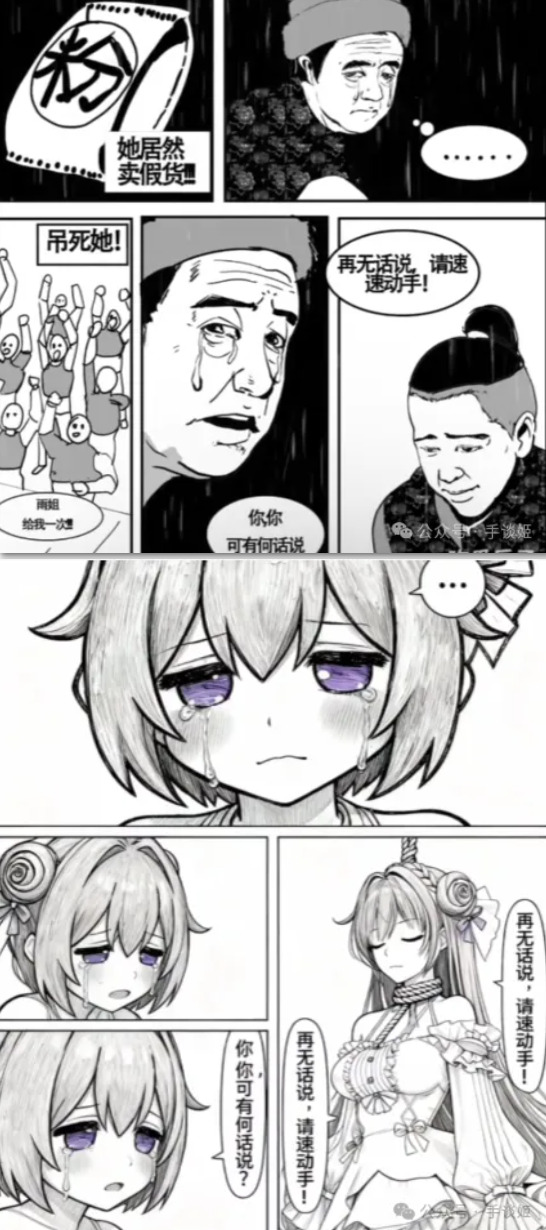 做一个三格漫画,最上边一行一格,下面一行左右两格。最上方格由第一张图的角色作为主角,角色流着眼泪,嘴巴却紧闭,幽怨地盯着镜头,对话框内:“……”。左下角的第二格依然由第一张图的角色作为主角,角色悔恨地流着眼泪,哭泣着询问:“你,你可有何话说?”。右下角的第三格由第二张图的角色作为主角,角色带着决绝的表情,有一根绳子从上方系在他的脖子上,他闭着眼神情庄重地回复道:“再无话说,请速动手!”,整体采用黑白画风,所有对话发生在对话框内,无重复内容,所有镜头以近身特写的方式表现,注意每格内的角色,我再次重复一遍,前两格为我发送的第一张图的角色,最后一格为我发送的第二张图的角色。
