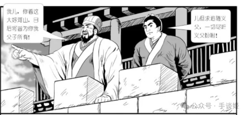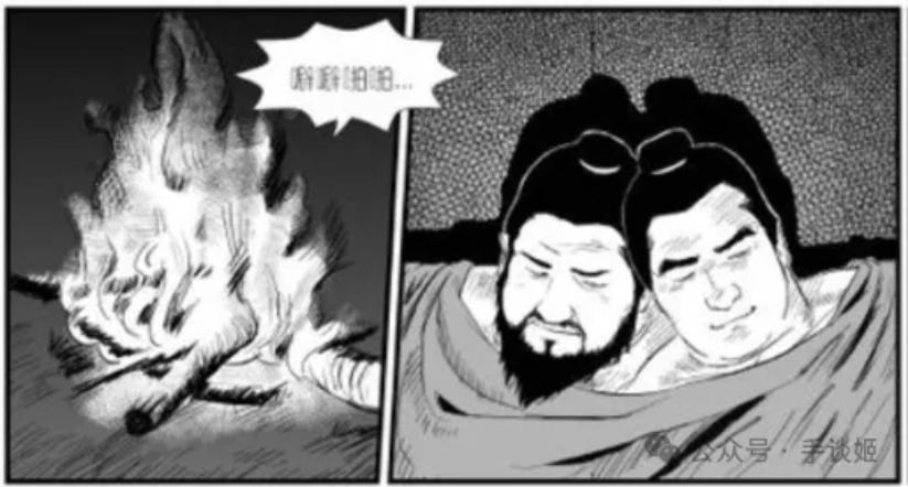 漫画中,吕布和董卓发生了激烈的战斗,但董卓那肥硕的身材怎么能打得过健硕的吕布呢?于是董卓处于下风。经过战斗,董卓见识到吕布高超的戟技,而吕布也感受到董卓其实是个热心肠的人,二人自此惺惺相惜,同榻而眠。